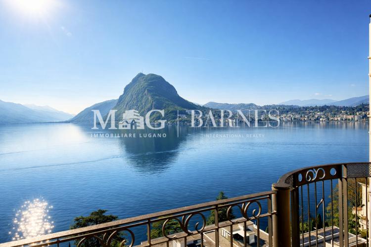 L'ingresso introduce in un ambiente ordinato e armonioso che accompagna verso la zona giorno, sviluppata come un luminoso open space con soggiorno, zona pranzo e cucina moderna integrata. Le ampie superfici vetrate valorizzano la luce naturale e conducono al balcone, da cui si gode una splendida vista sul Lago di Lugano e sul Monte San Salvatore.