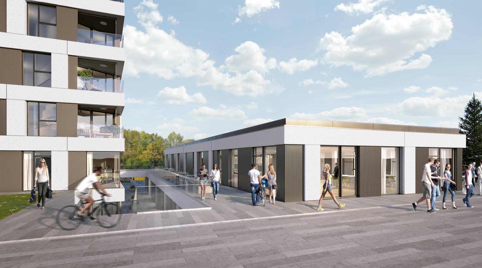 Composto da due edifici che si fronteggiano ma si completano a vicenda, il complesso riunisce, da un lato, eleganti appartamenti che offrono una visione chiara ai futuri occupanti e, dall'altro, ospita attività commerciali.