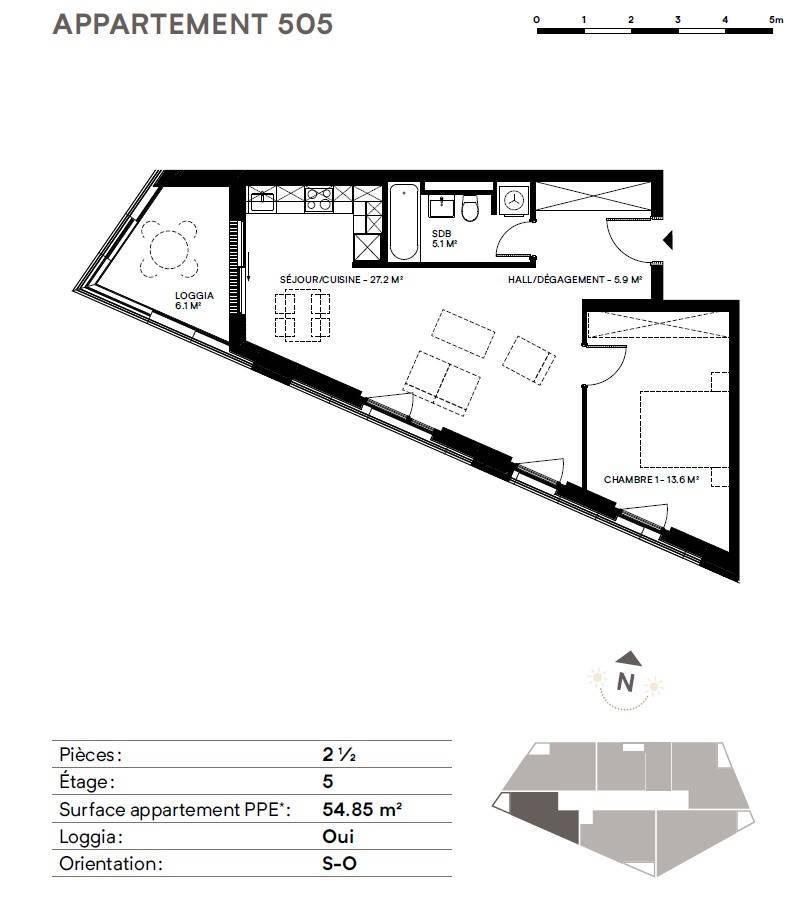 L'appartamento proposto, esposto a Sud-Ovest al 5° piano, è così disposto: