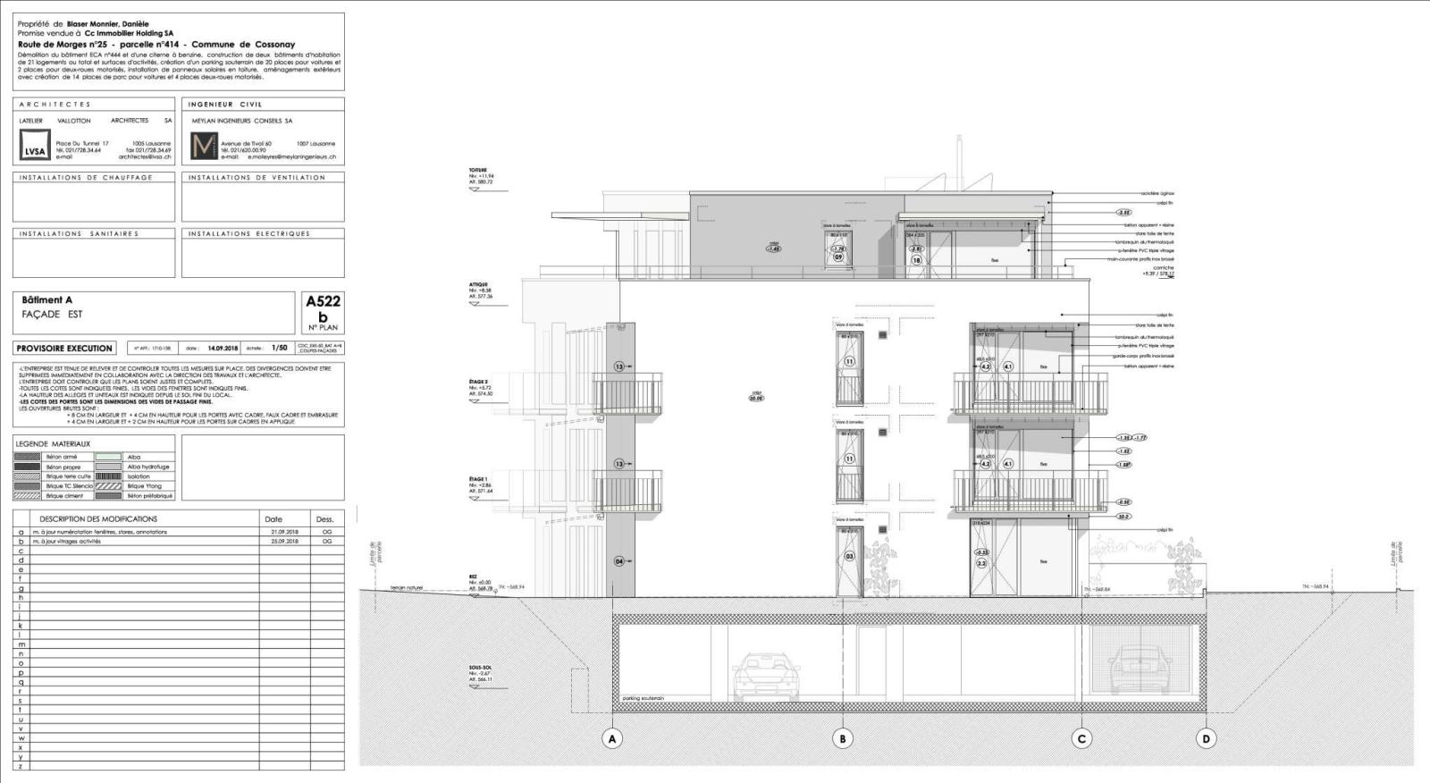 - L'architettura contemporanea dell'insieme è sobria con scelte cromatiche contrastanti tra i solai e i solai. La scelta dei materiali, come il cemento pulito, per i balconi e parte delle superfici delle attività si abbina armoniosamente alle ringhiere in acciaio inossidabile e alla trama delle facciate in intonaco fine.