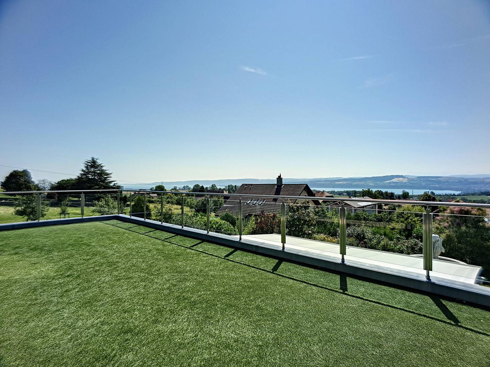 Disposta su 3 livelli, la casa dispone di spazi generosi e i soggiorni beneficiano di grandi vetrate che lasciano entrare la luce naturale e permettono ai suoi abitanti di godere di uno splendido panorama sul lago, sulle Alpi e sul Giura.