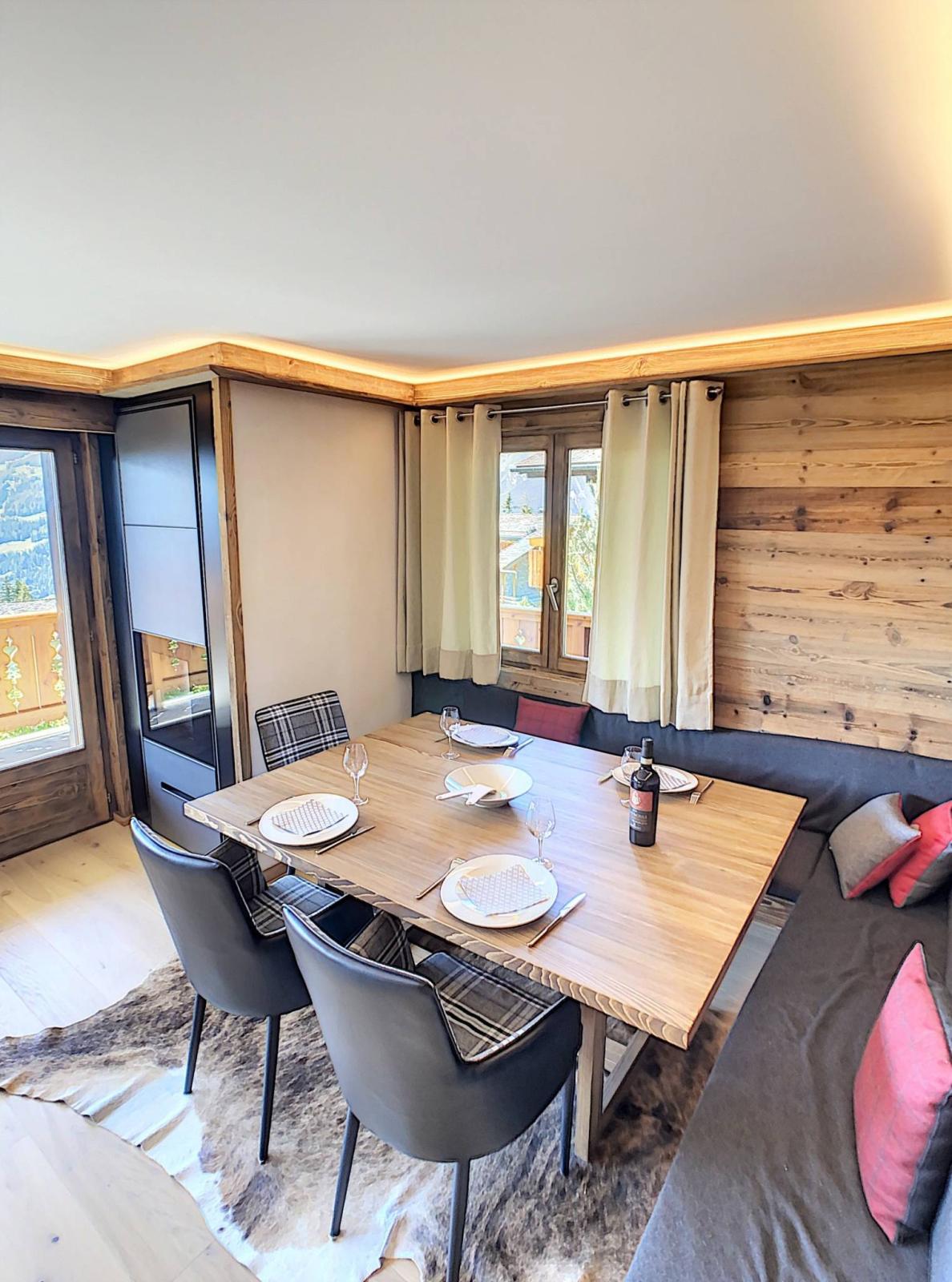 La zona pranzo e la cucina a vista beneficiano di un'atmosfera molto calda, soprattutto grazie alla presenza di una moderna stufa a pellet controllabile a distanza.