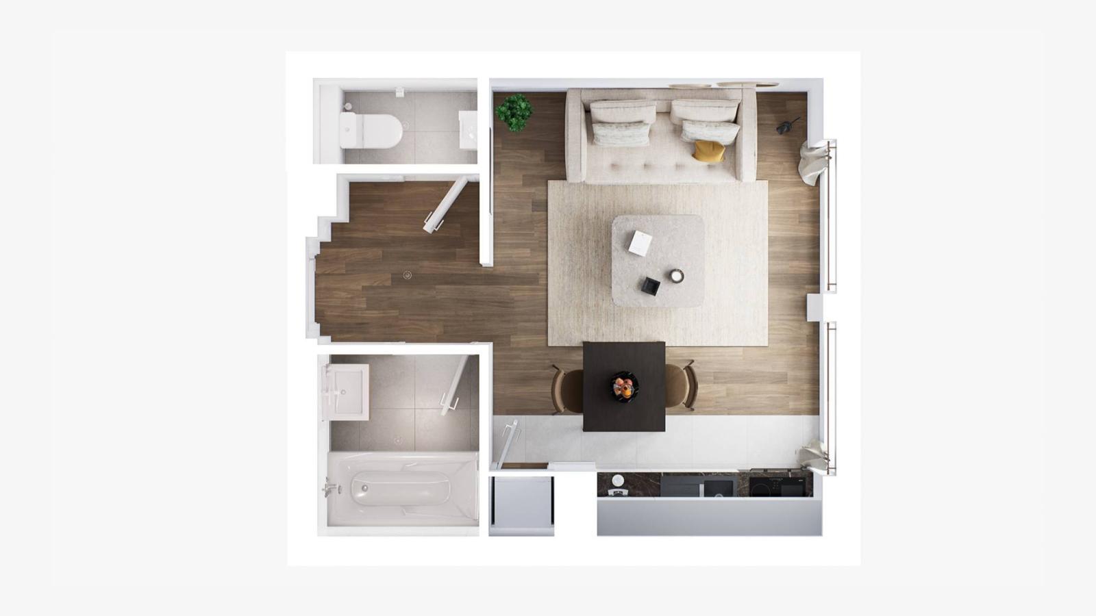 Il lotto H-301 è un appartamento di 1,5 locali di 33 mq al 3° piano distribuito come segue: