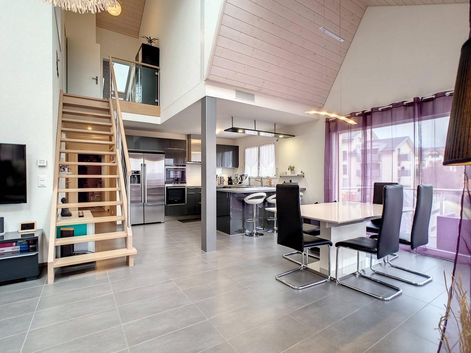 Distribuite in duplex, le camere beneficiano di superfici generose e le grandi vetrate e lucernari garantiscono molta luce. La cucina è ben attrezzata con bar, vaporiera, forno e frigorifero americano. Una grande terrazza è accessibile dal soggiorno/sala da pranzo e promette bellissime serate estive con vista panoramica sulla Plaine de l'Orbe e sulle Alpi. Su questo livello si trovano anche due camere da letto, un ripostiglio, un bagno/wc e un wc separato.