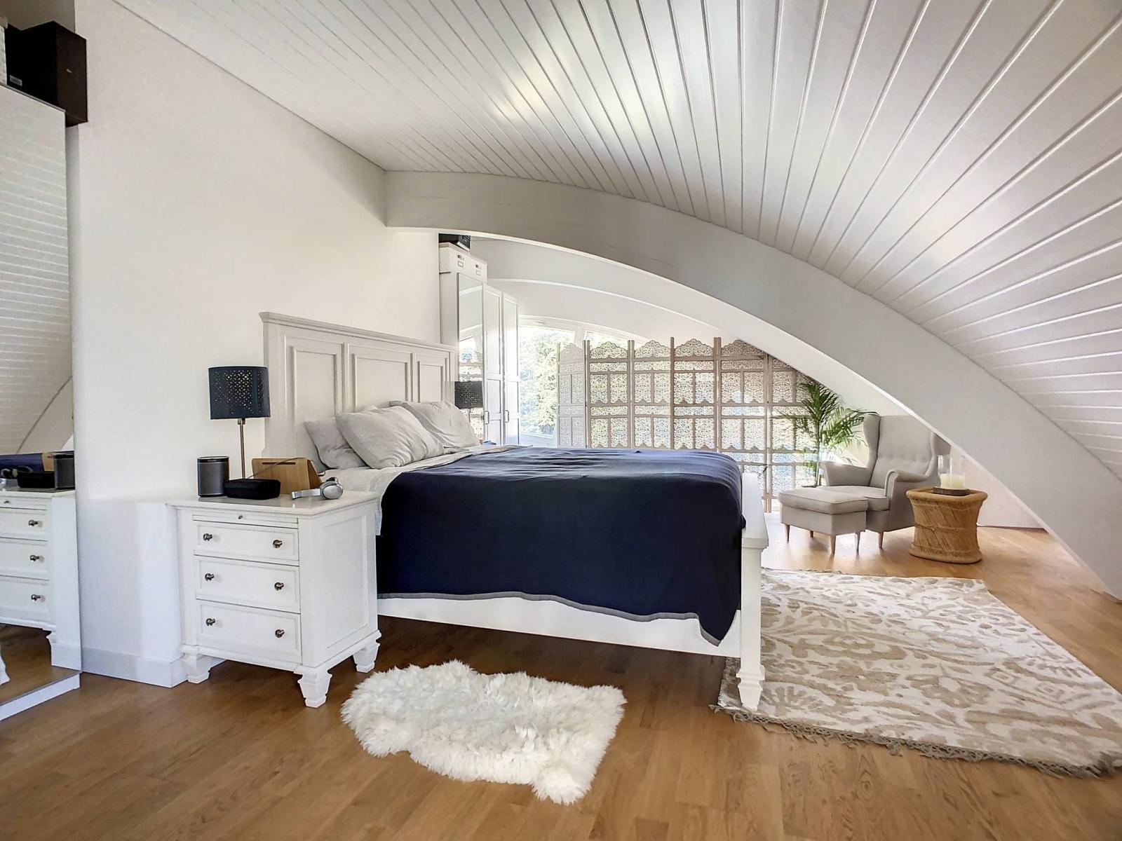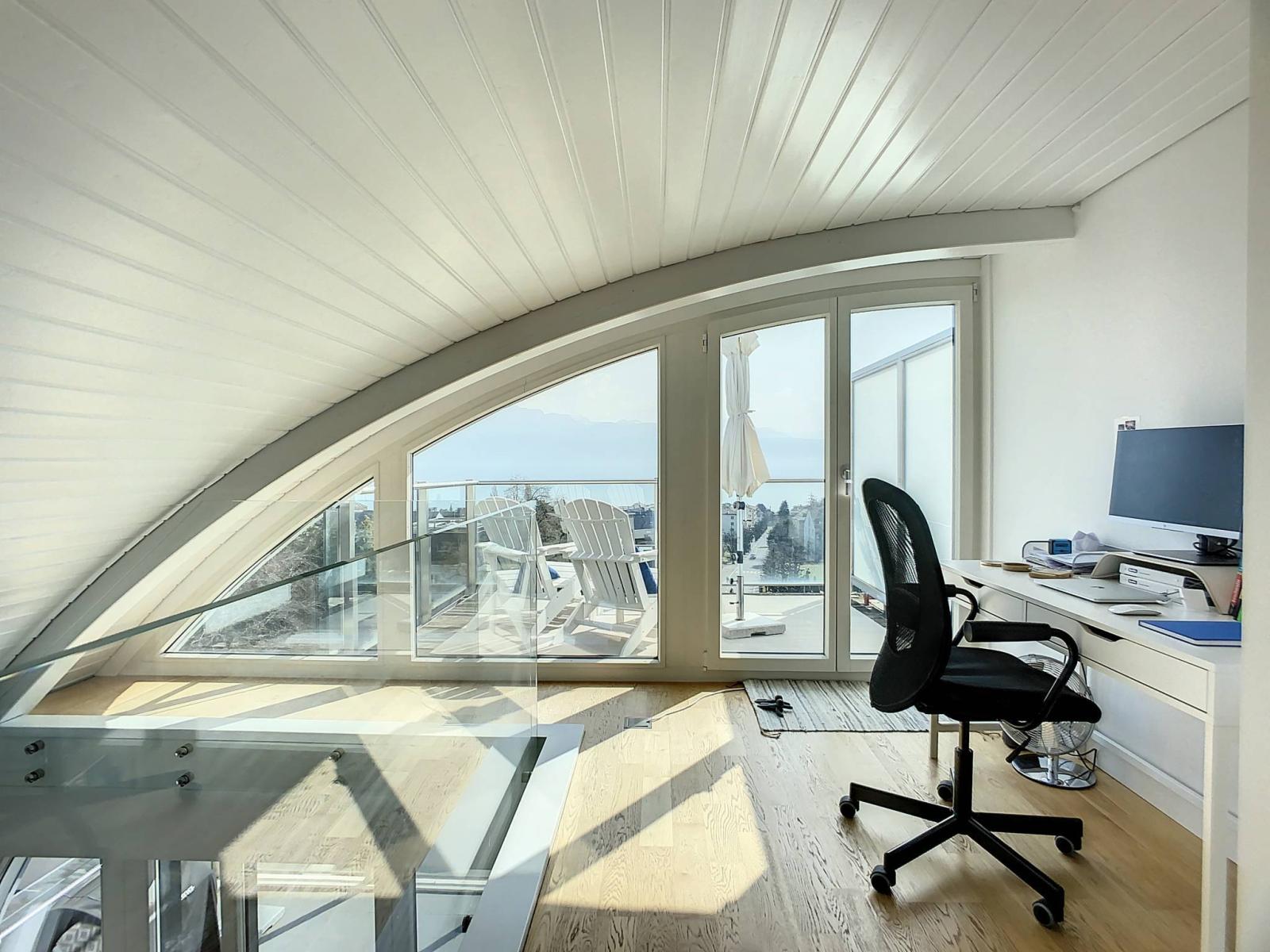 Un ampio secondo piano ospita un ufficio, oltre a una camera da letto e il relativo bagno con doccia privato, in stile loft.