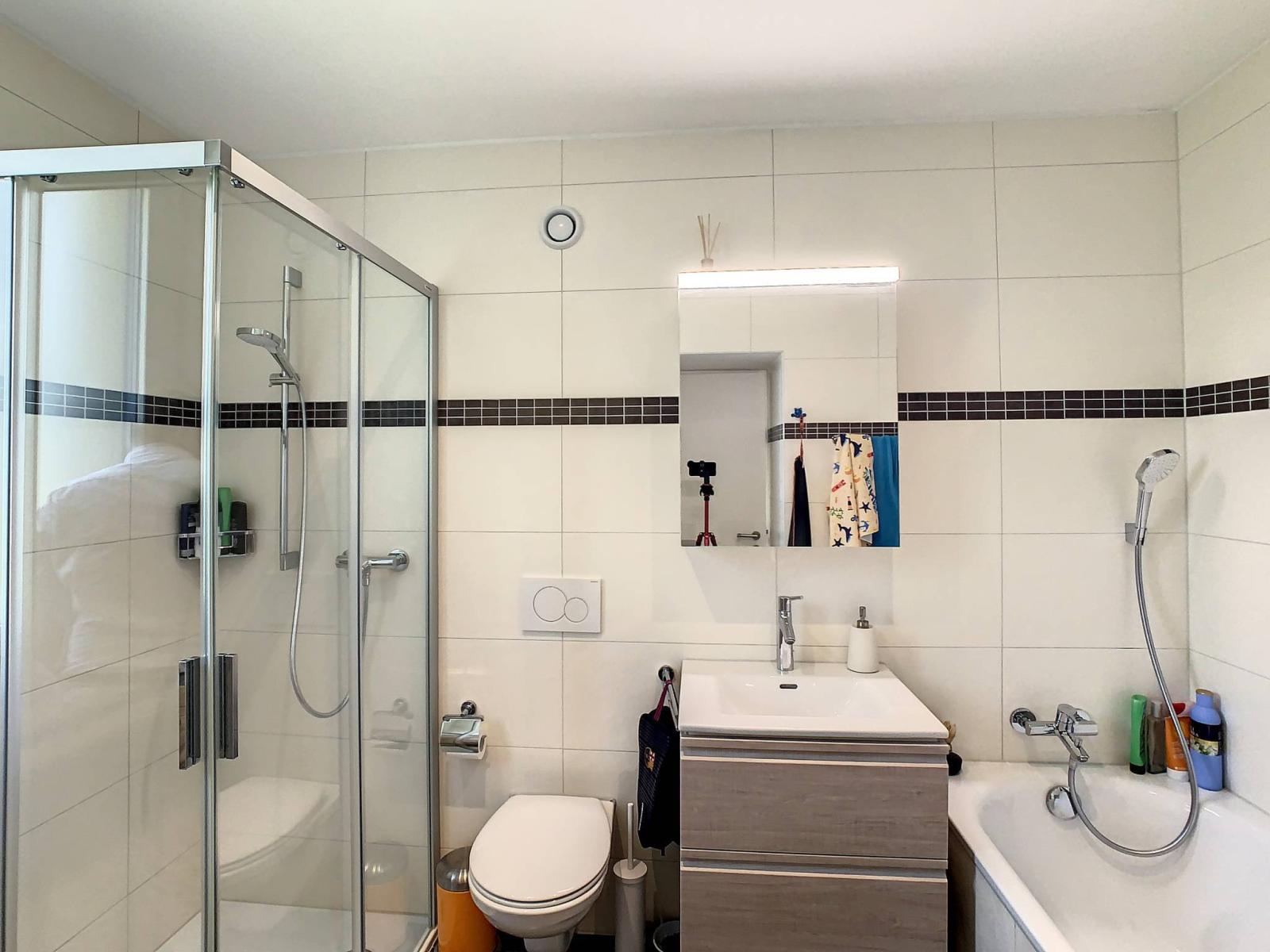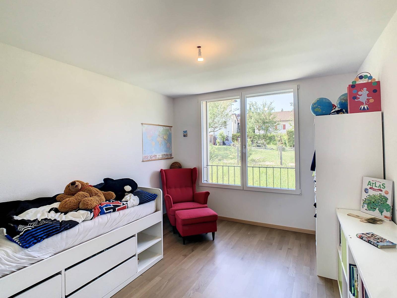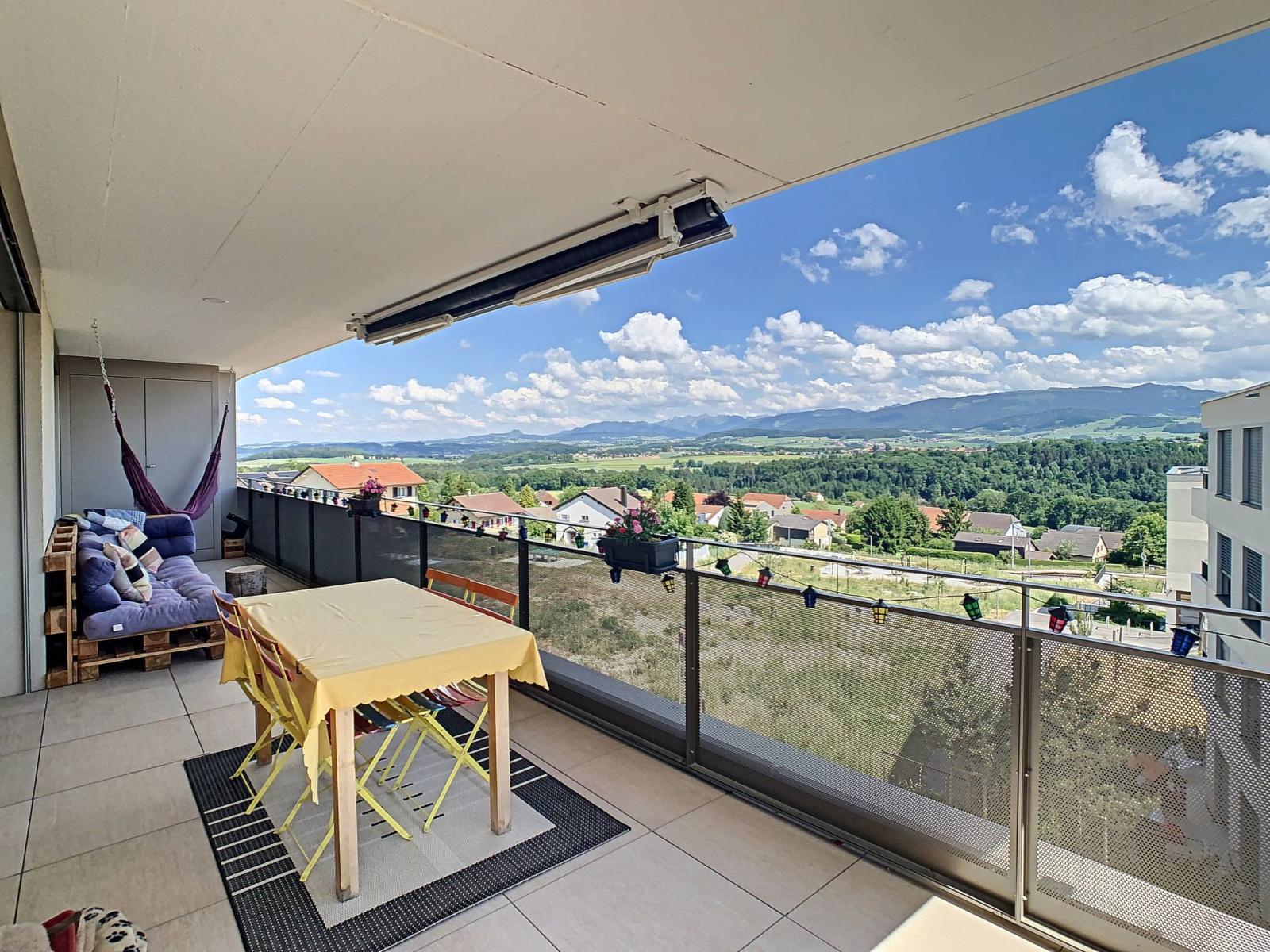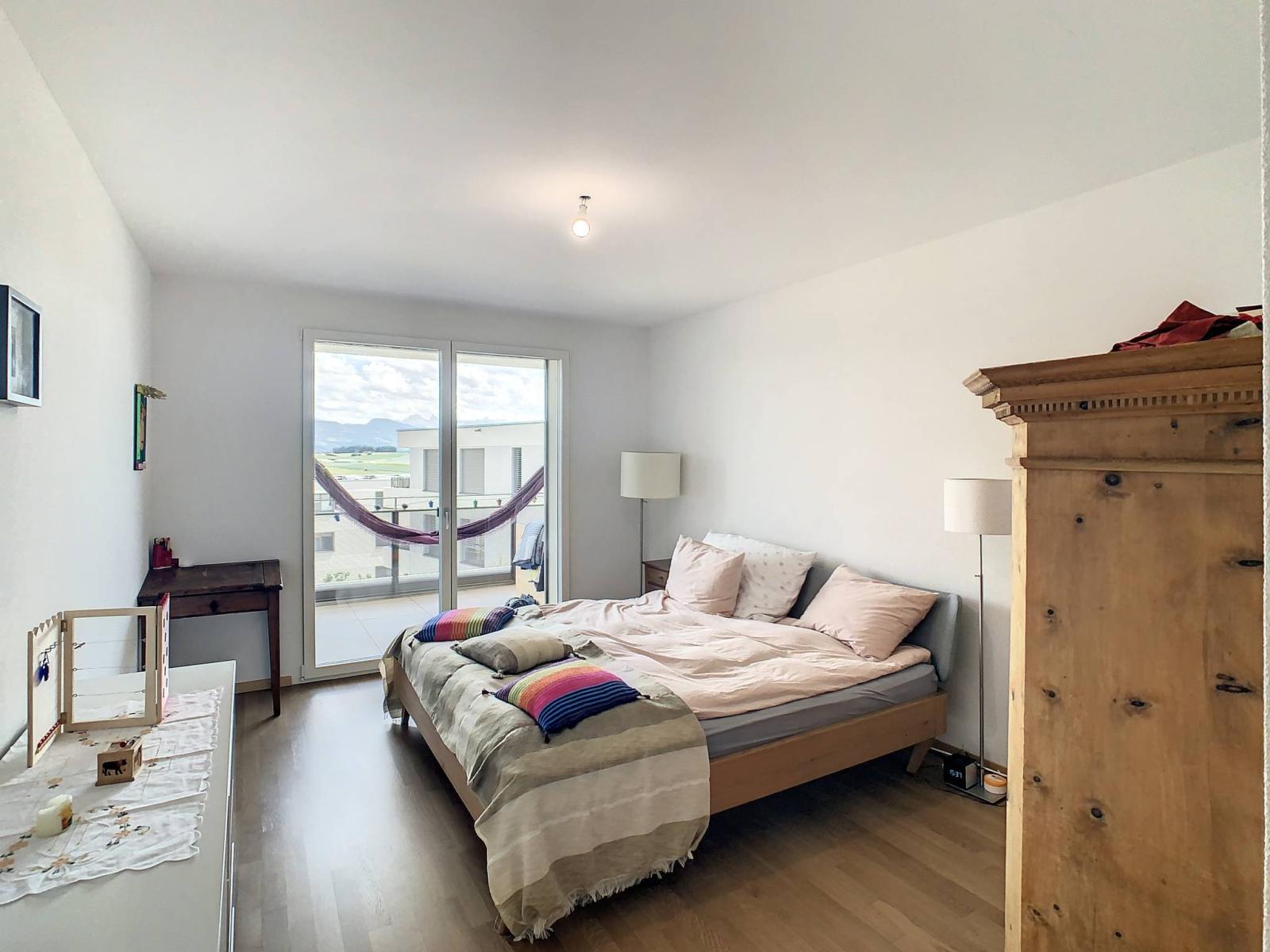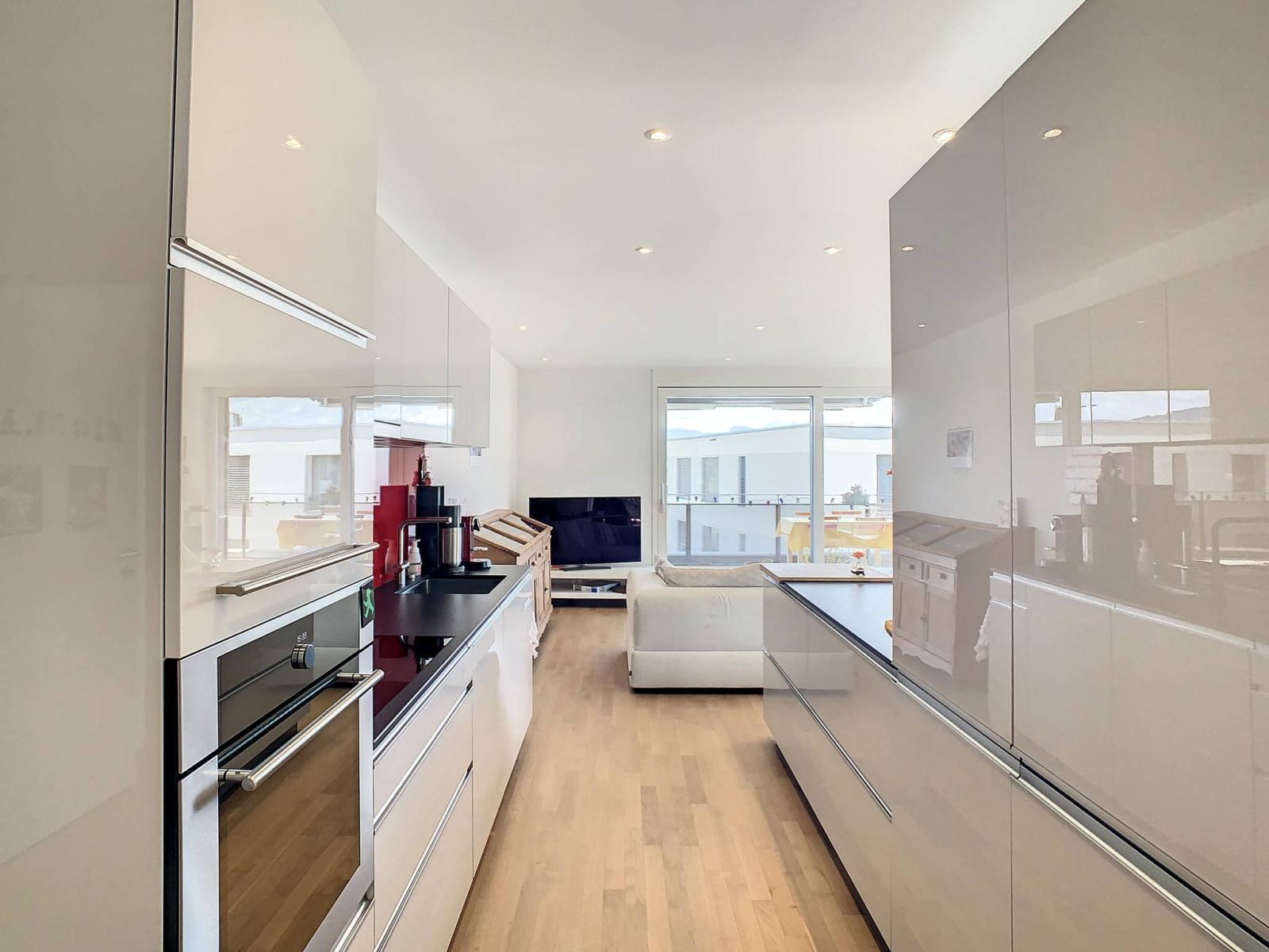 Questo spazioso appartamento di 4,5 locali, situato al 2° piano di un edificio PPE di 8 unità costruito nel 2019, totalizza 107,2 m² di superficie abitabile integrata da un balcone di 28,2 m², portando la superficie ponderata a 123,3 m².