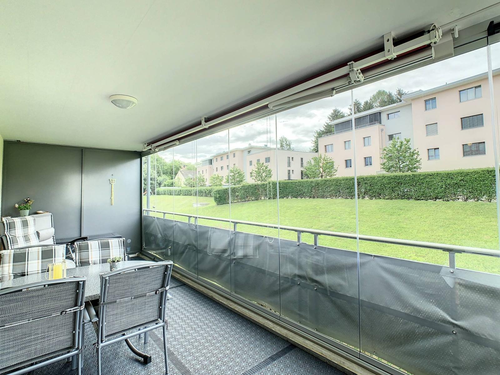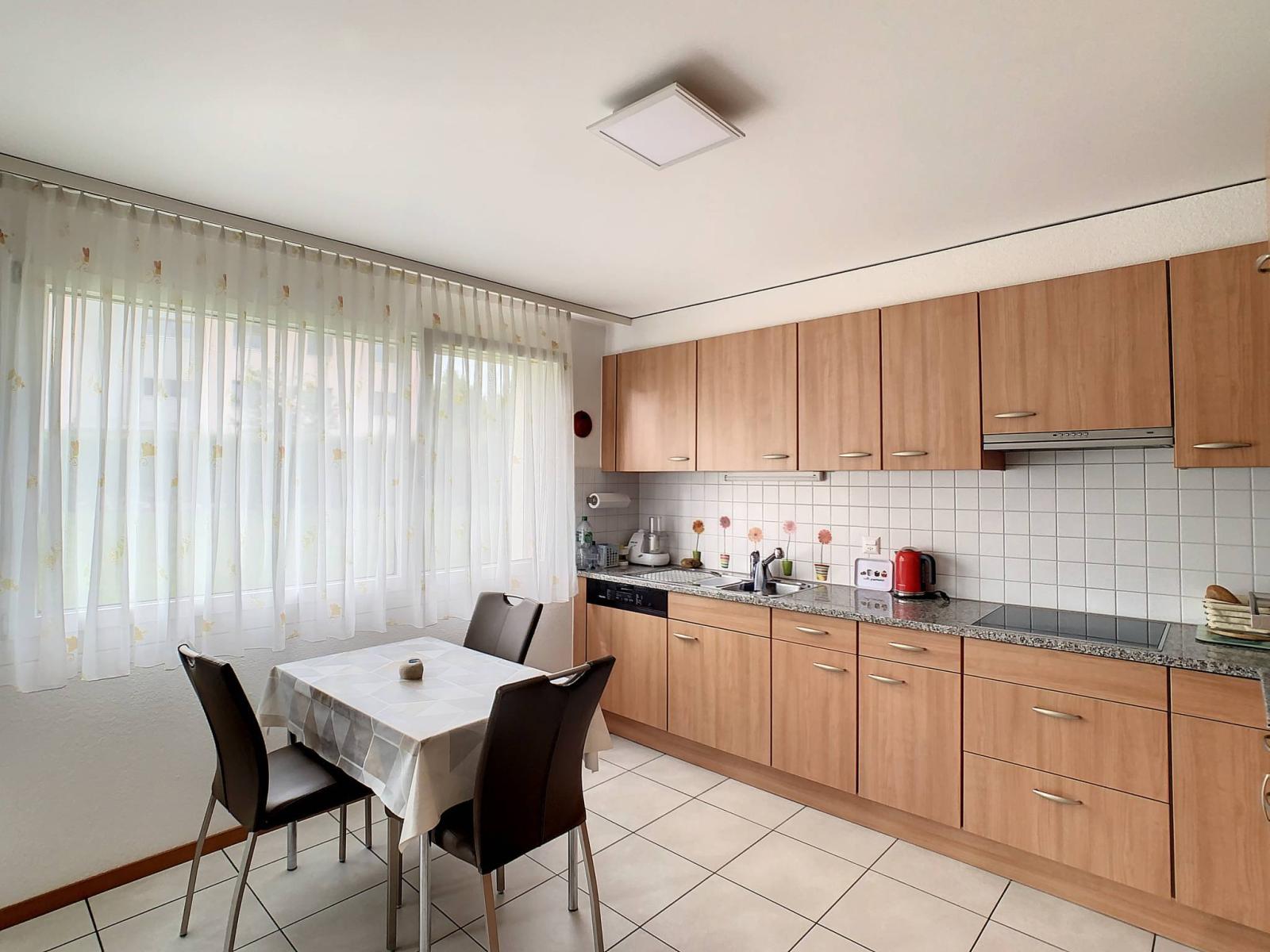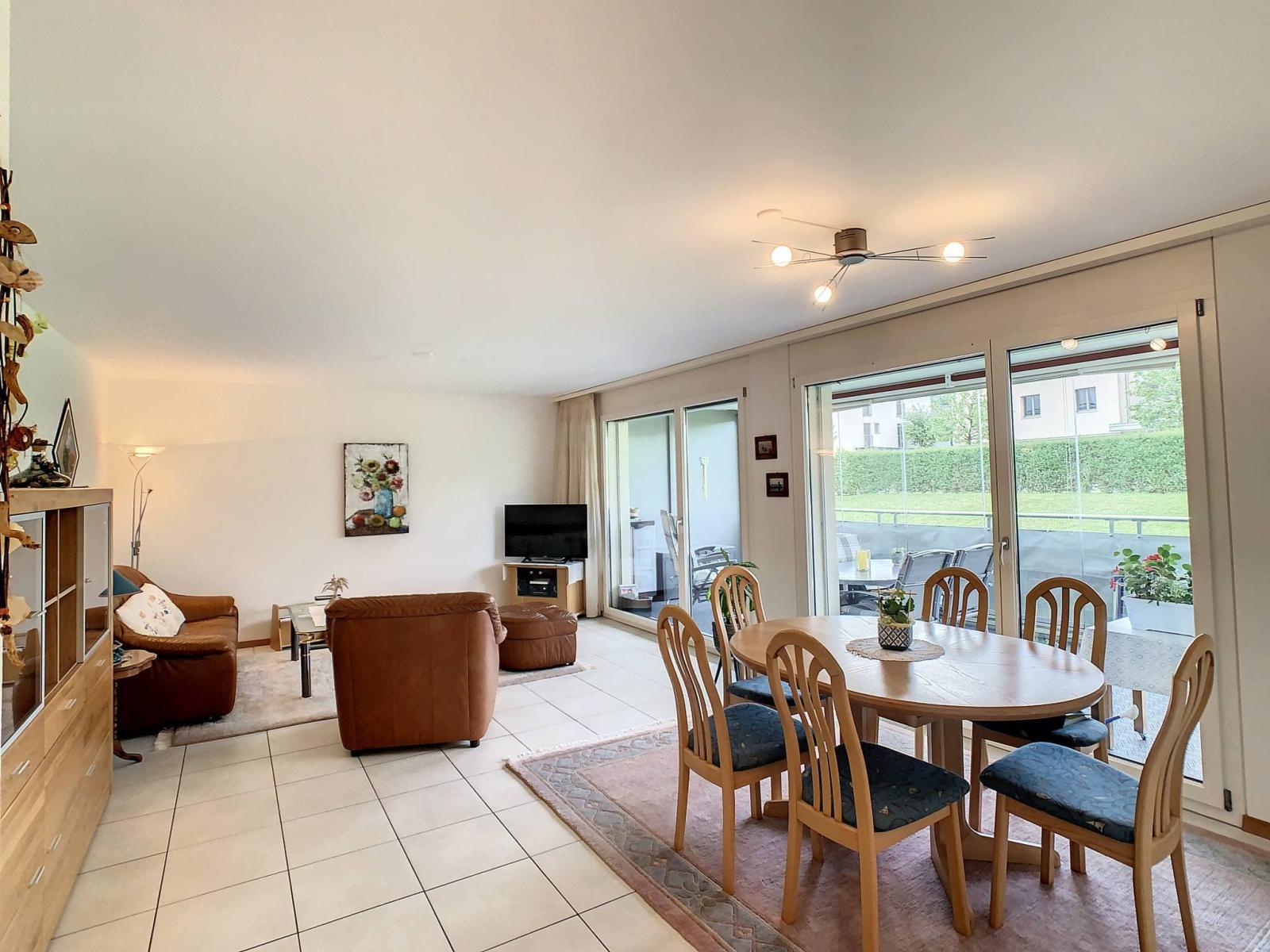 Questo affascinante appartamento di 3,5 locali dispone di una superficie abitabile di 90 m², completata da un ampio balcone di 17 m² (con vetrata scorrevole), che porta la superficie ponderata a 99 m². Si trova al 1° piano di un edificio PPE con ascensore, costruito nel 2004.