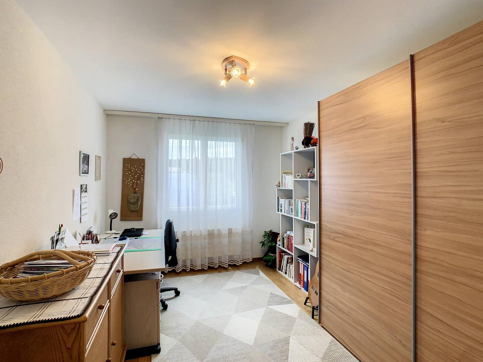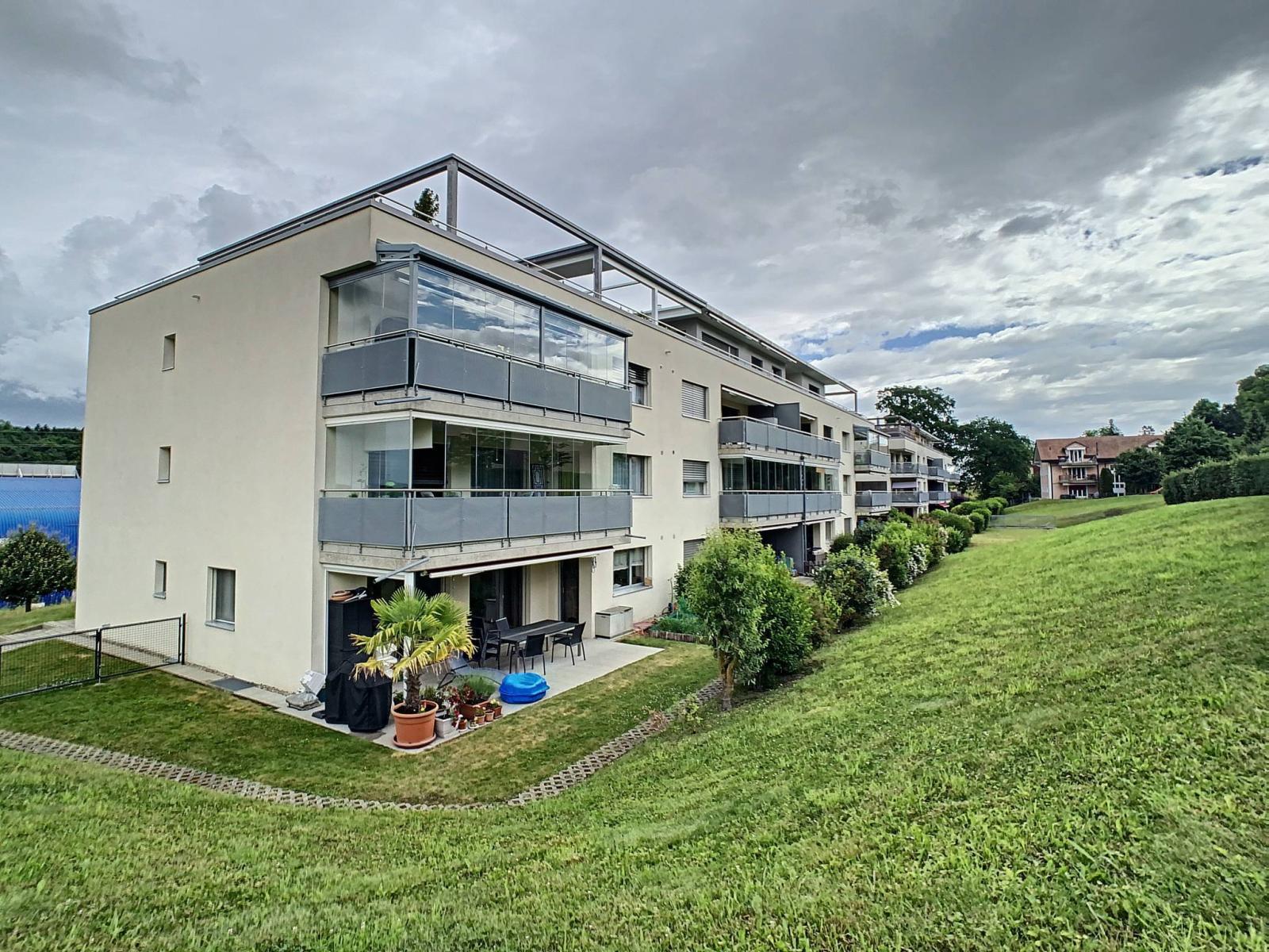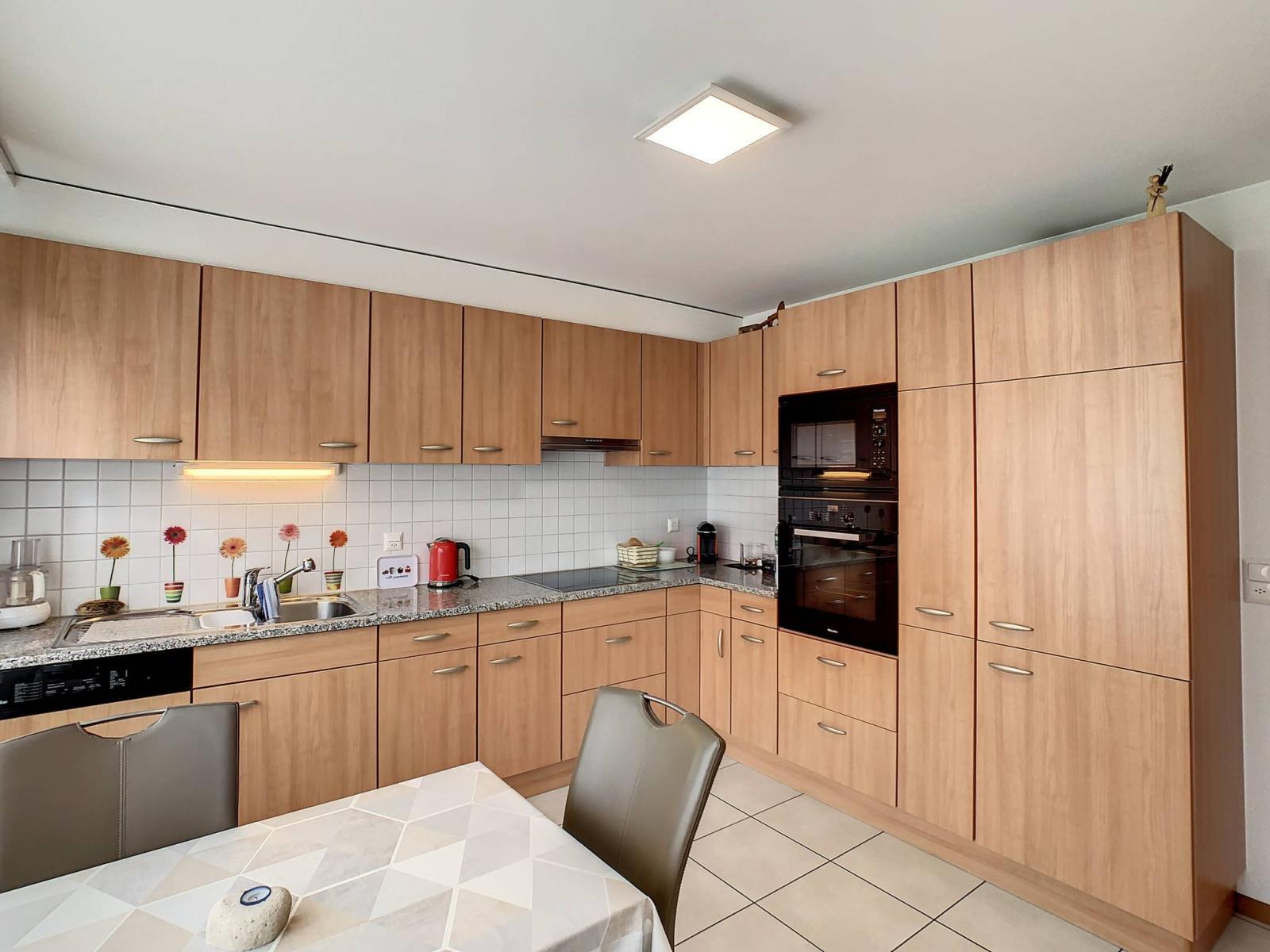 Questo affascinante appartamento di 3,5 locali dispone di una superficie abitabile di 90 m², completata da un ampio balcone di 17 m² (con vetrata scorrevole), che porta la superficie ponderata a 99 m². Si trova al 1° piano di un edificio PPE con ascensore, costruito nel 2004.