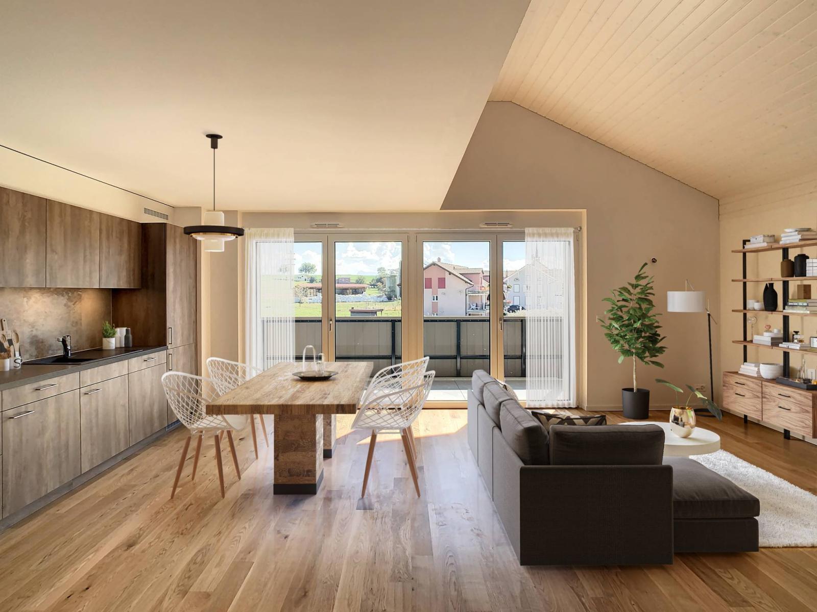 Idealmente situato tra Friburgo e Payerne, questo nuovo appartamento di 3,5 locali, situato precisamente nel villaggio di Middes, dispone di una superficie abitabile di 103 m² e di un balcone di 14 m², per un totale di una superficie ponderata di circa 110 m². Offre un ambiente di vita idilliaco che unisce la vicinanza alle 2 città beneficiando di un ambiente verde, ai margini di una zona agricola.