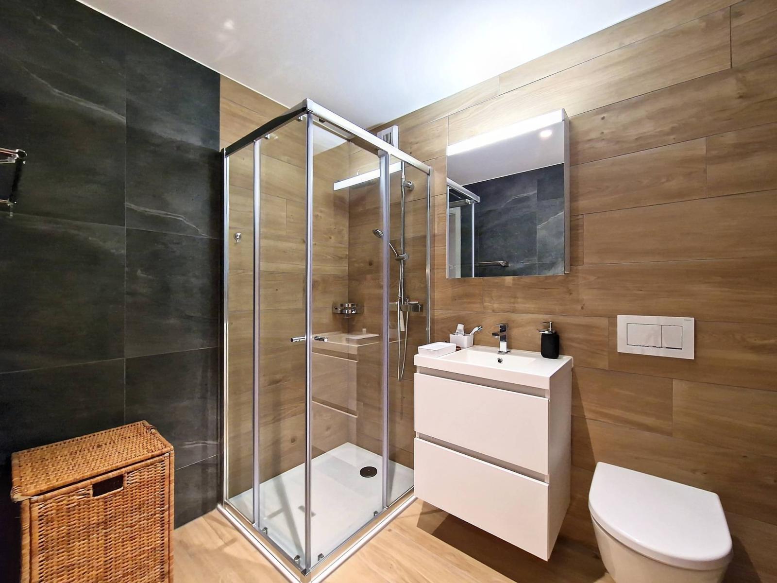 L'ampio bagno con doccia è dotato di colonna di lavaggio. L'acqua calda e il riscaldamento distribuito a pavimento sono collegati da remoto e consentono di beneficiare di spese inferiori alla media.