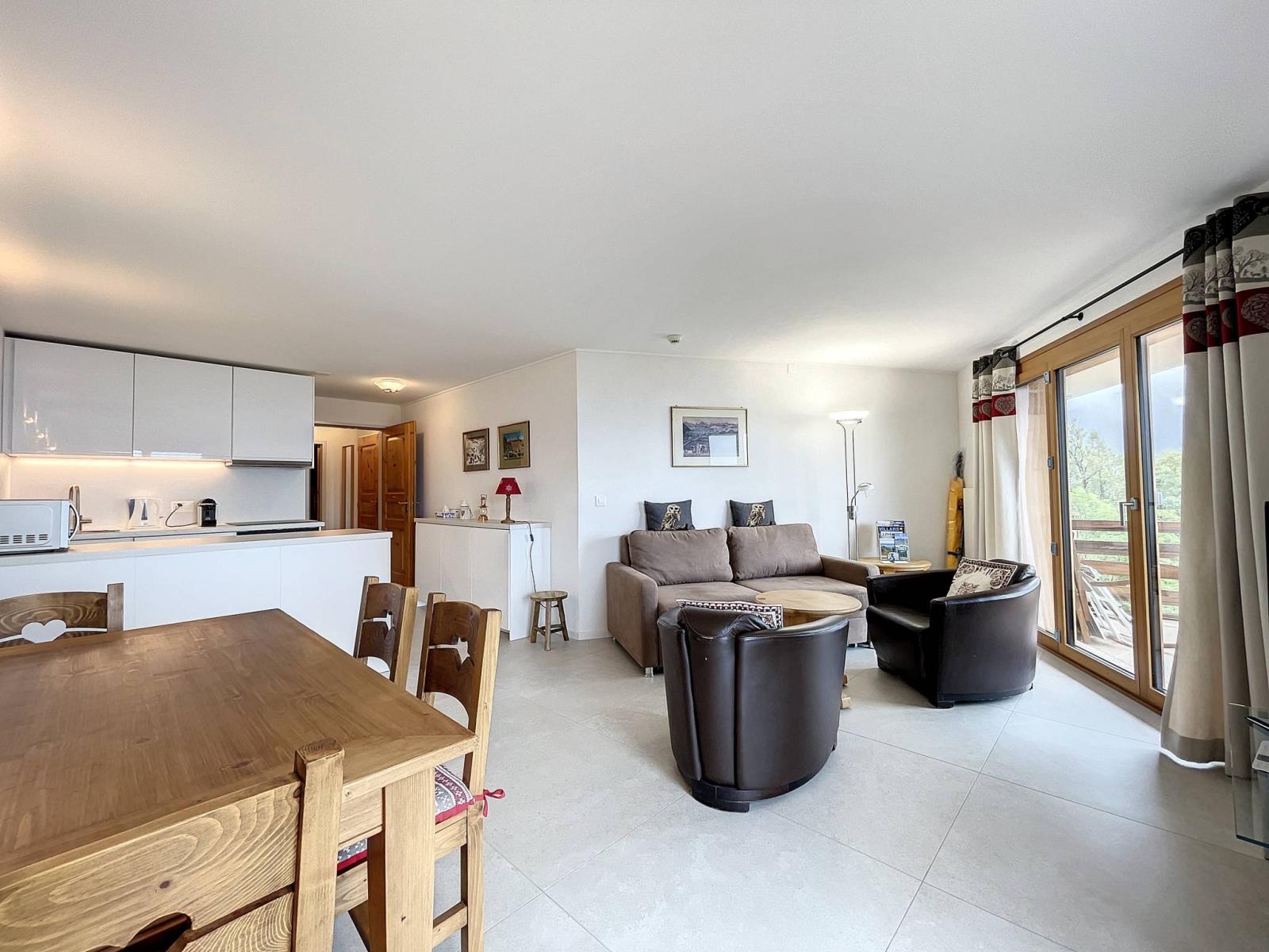 Un soggiorno con sala da pranzo e accesso all'ampio balcone; Una cucina aperta; Una camera da letto con balcone e bagno privato con doccia/WC;