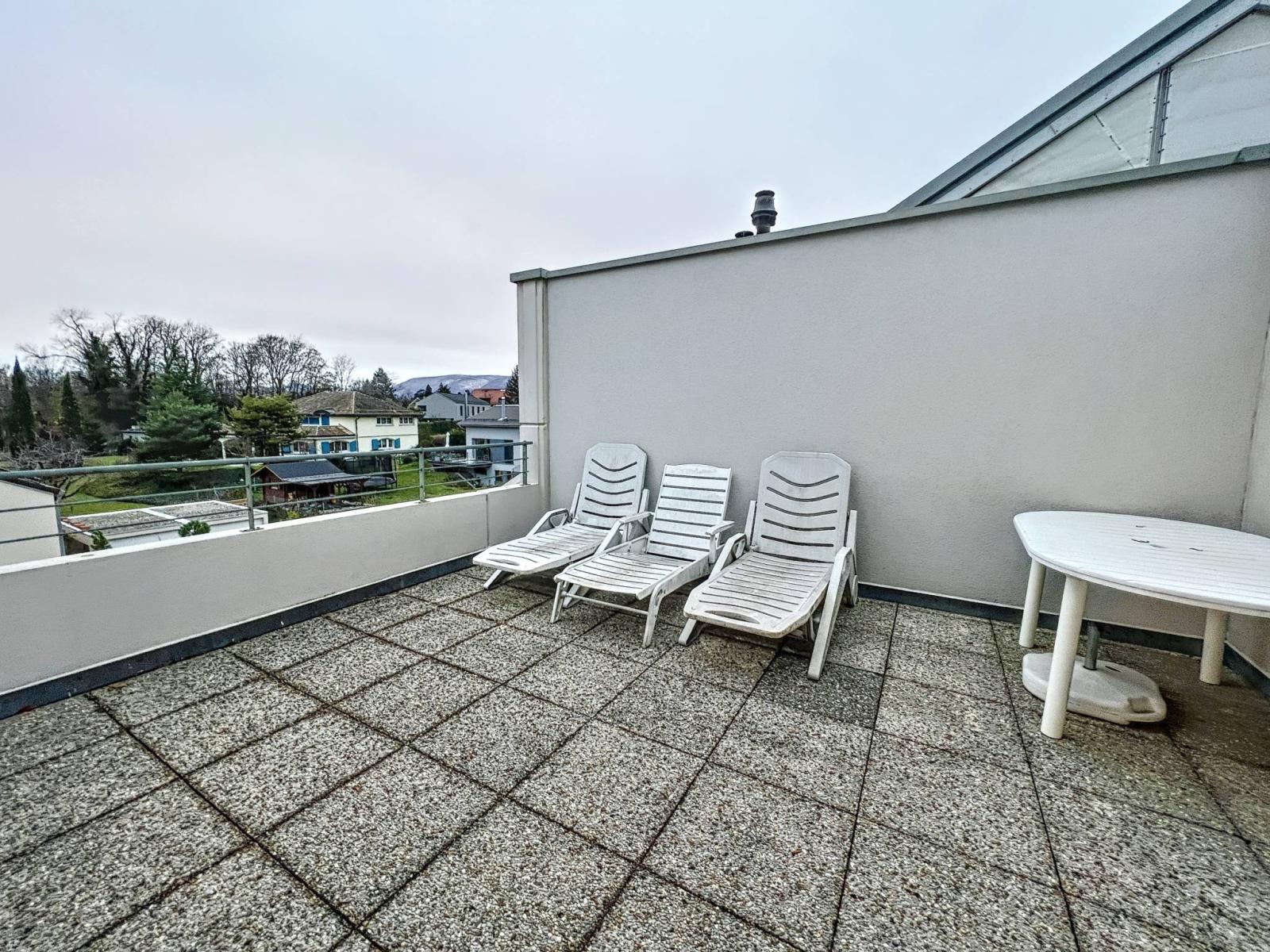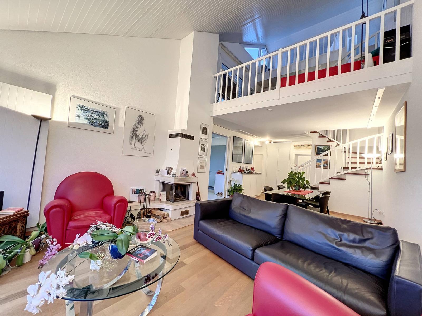 Al piano superiore si trova un'ampia camera matrimoniale, un bagno con doccia, oltre ad un luminoso soppalco aperto sul soggiorno con terrazzo/solarium. Un secondo soppalco (12,7 mq), attualmente adibito a ufficio, con una bellissima vista sul lago e il Giura, completa la sistemazione.