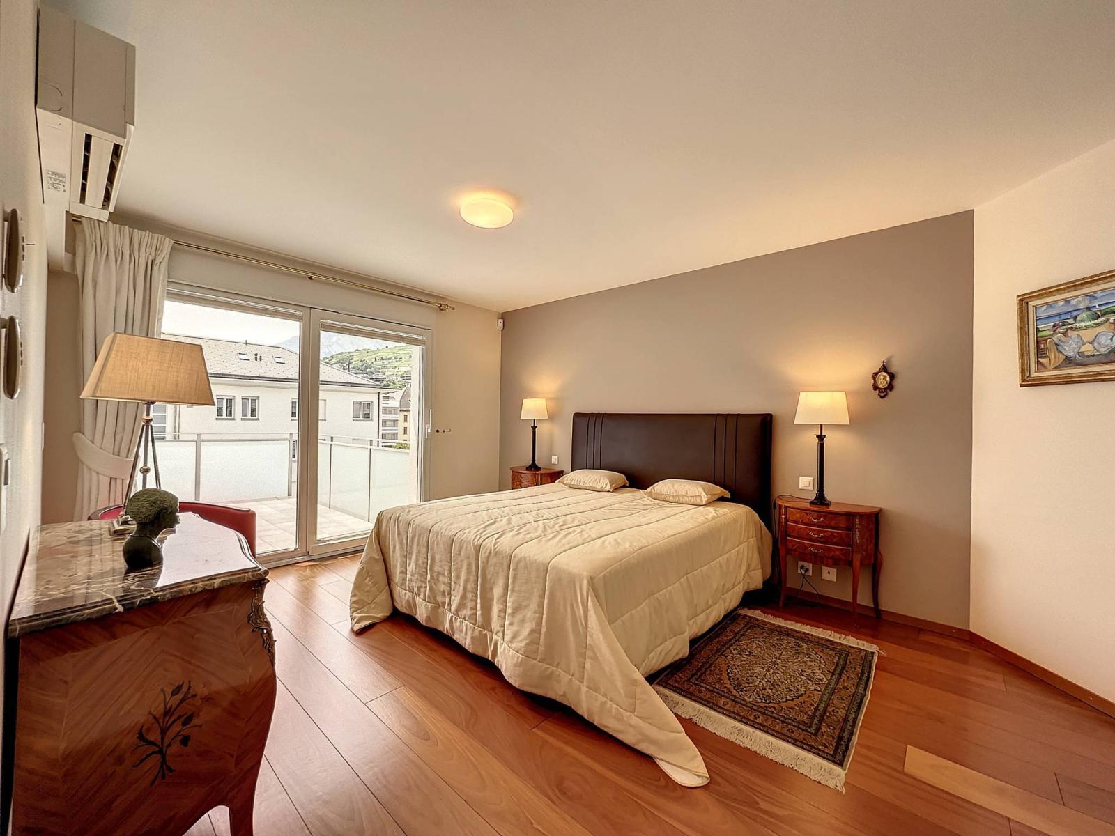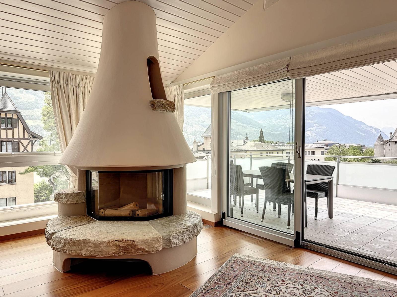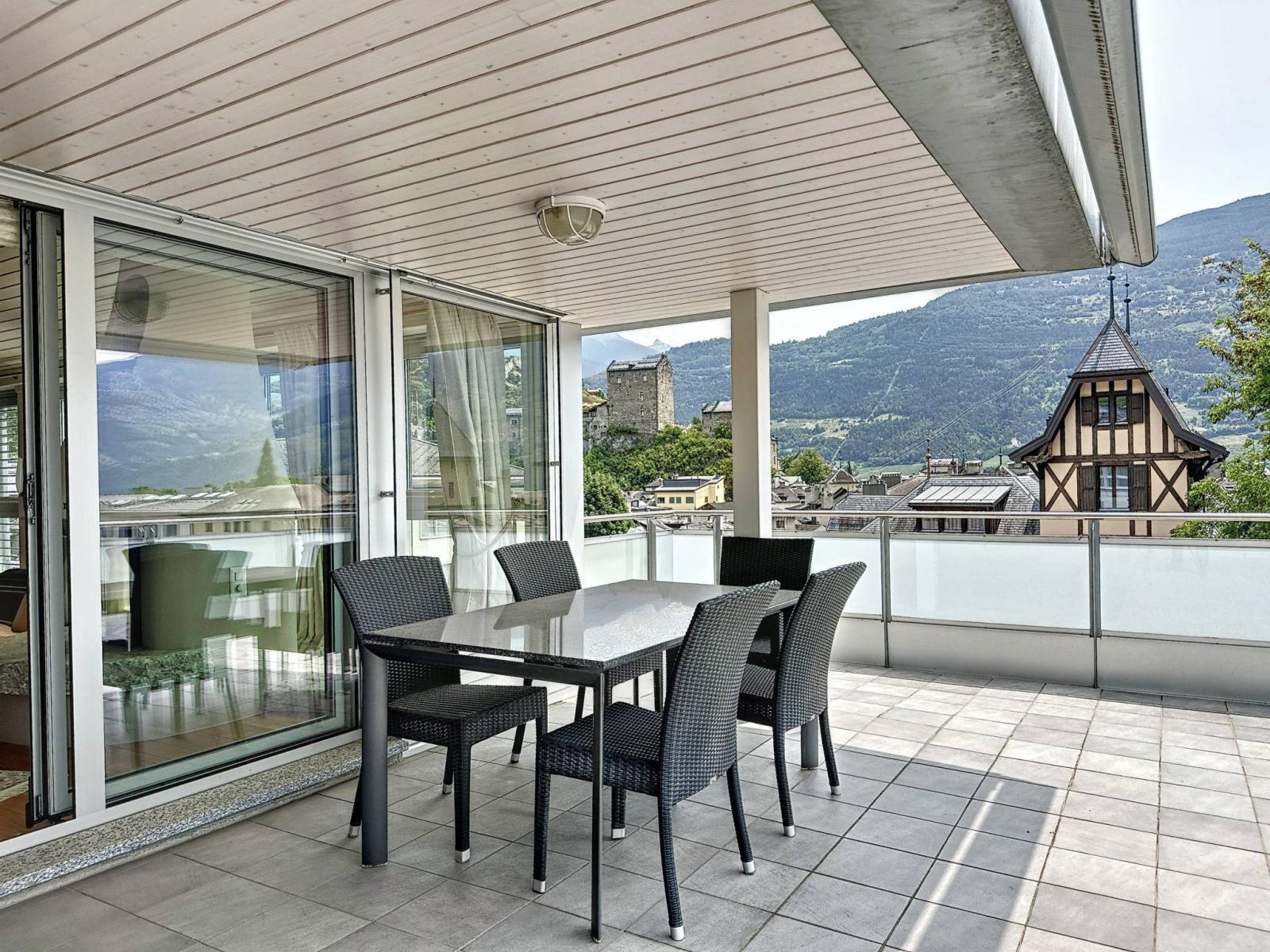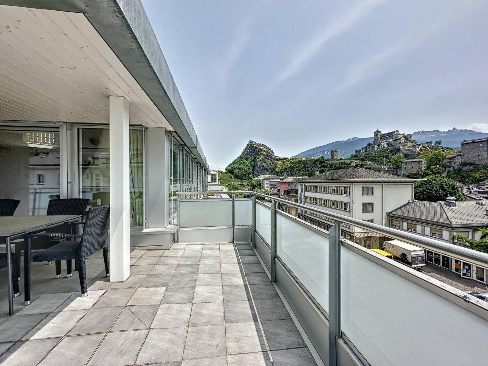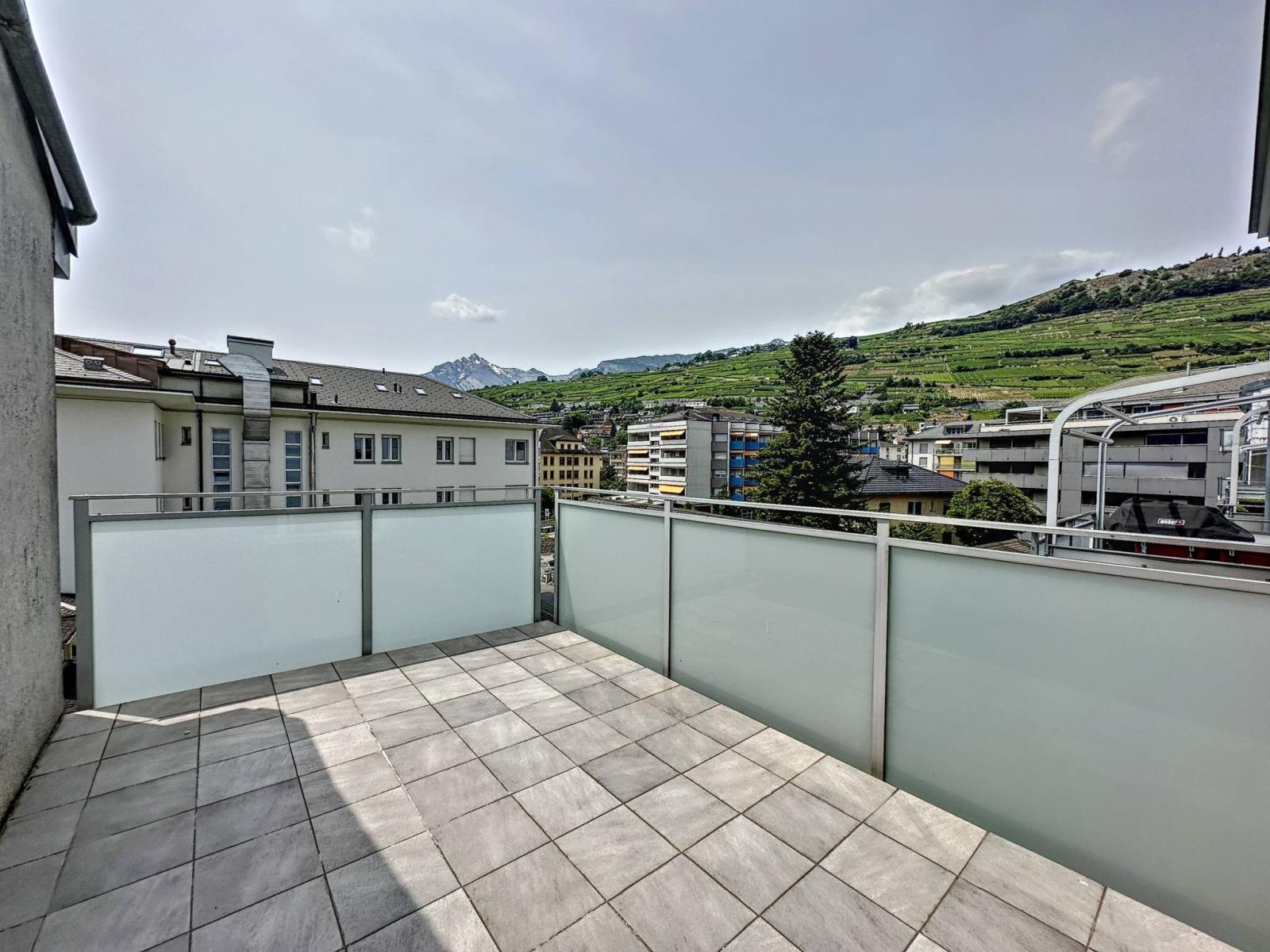 Il suo punto di forza sono i 3 terrazzi-balconi per un totale di 56 m2 esposti a sud e ovest, soleggiati tutto l'anno, perfettamente arredati con tapparelle elettriche e che offrono una vista panoramica e dominante sui castelli di Valère e Tourbillon e sulle Alpi.