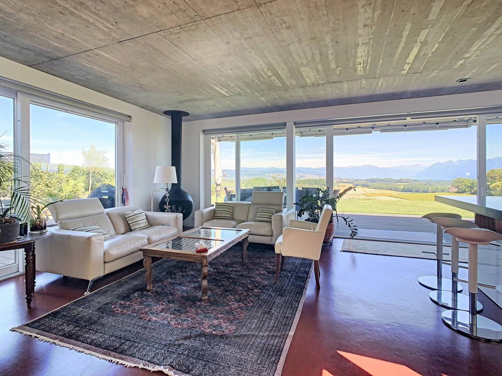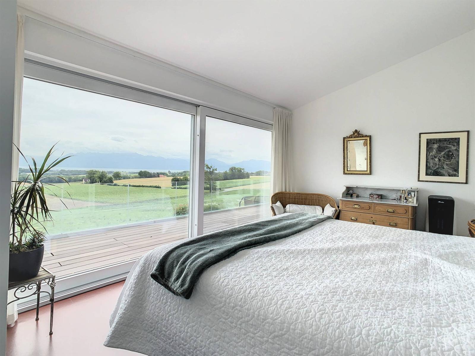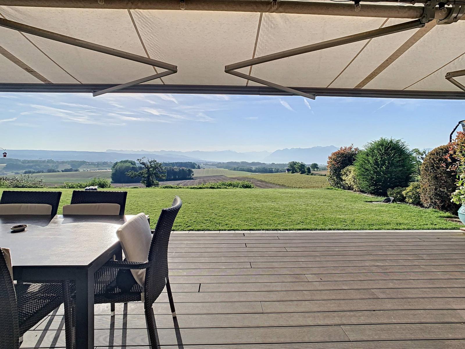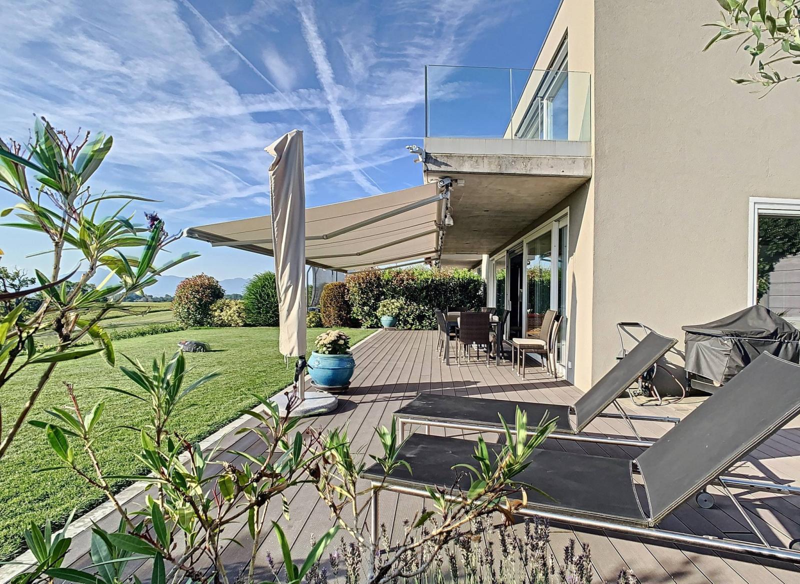 Il giardino e la terrazza di 110 m² godono di una magnifica vista libera sul lago e sulle montagne compreso il Monte Bianco. Una vasca idromassaggio da 4-6 posti completa l'esterno.