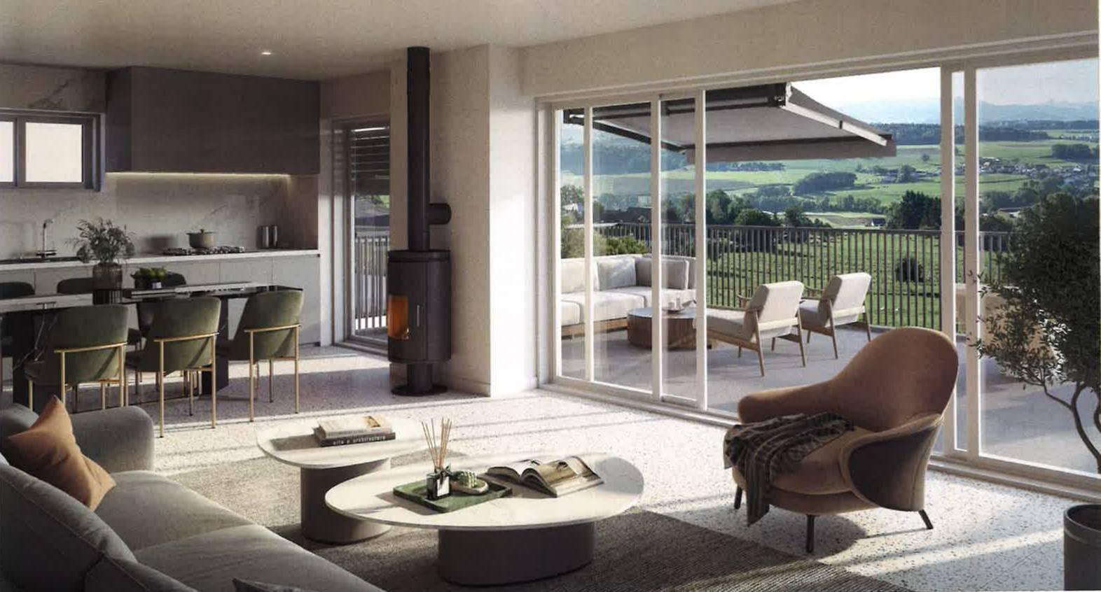 La nuova residenza “Les Terrasses du Clos” si trova in un ambiente bucolico, nel cuore dell'incantevole cittadina di Corbaz, a metà strada tra Courtepin e Friburgo.