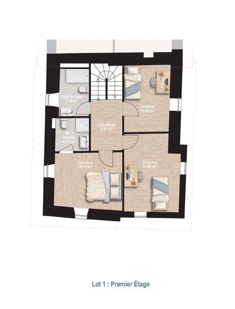 Le 3 camere da letto sono di buone dimensioni, a partire da circa 11 mq (camera dei bambini, camera degli ospiti o ufficio), fino a circa 14,90 mq. Inoltre, uno spazio di oltre 27 m² sotto la mansarda consentirà di realizzare una quarta camera da letto o uno spazio ufficio/tempo libero.