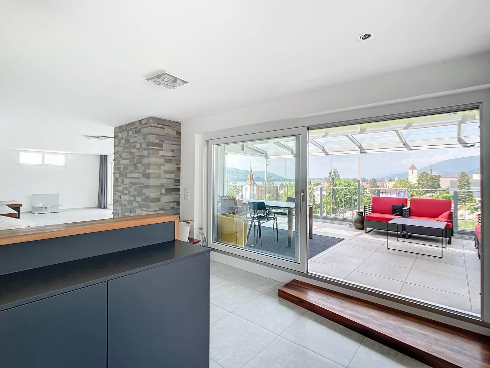 Con 57 m² di terrazza privata che offre una vista libera sul lago, sul Giura e sulla città, potrete godervi il massimo sole e vivere momenti di condivisione all'aria aperta con la famiglia e gli amici. Oltre alla veranda, questa sontuosa terrazza dispone di una zona relax coperta con vasca idromassaggio.