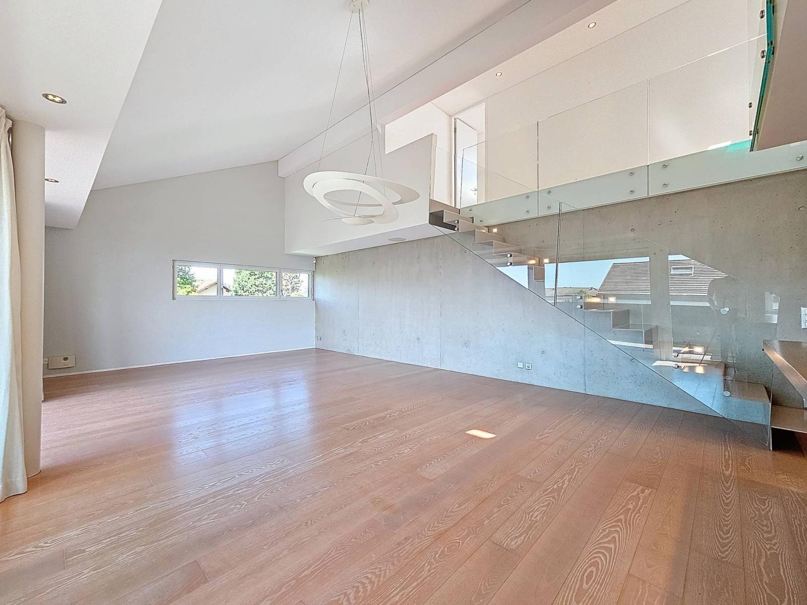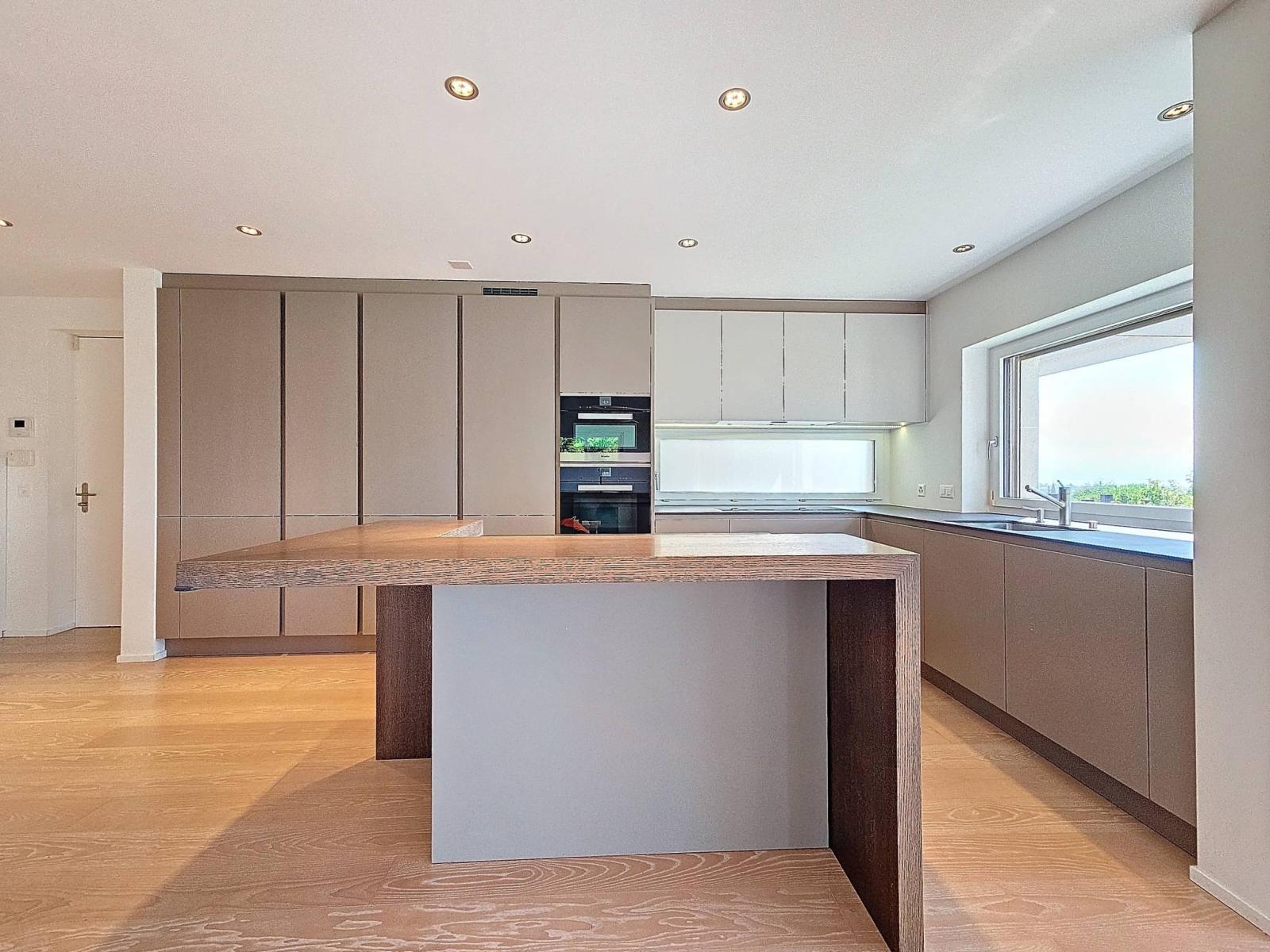 La cucina di fascia alta con isola centrale (cantina, elettrodomestici MIELE, piano di lavoro in granito) si apre su una magnifica zona soggiorno/soggiorno con soffitti alti fino a +4 metri. Questo salone è molto luminoso grazie alle sue vetrate e alla sua posizione mansardata sul frontone sud/ovest.