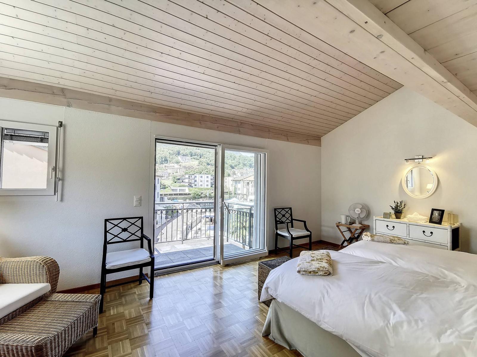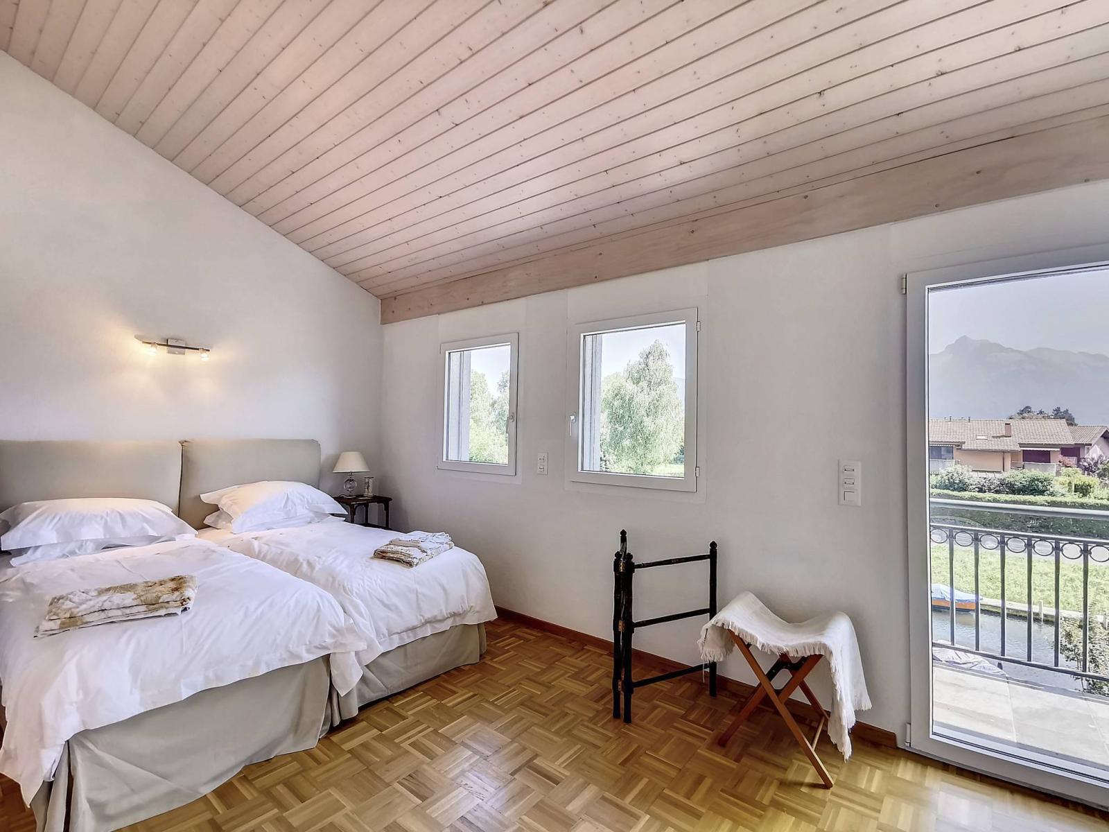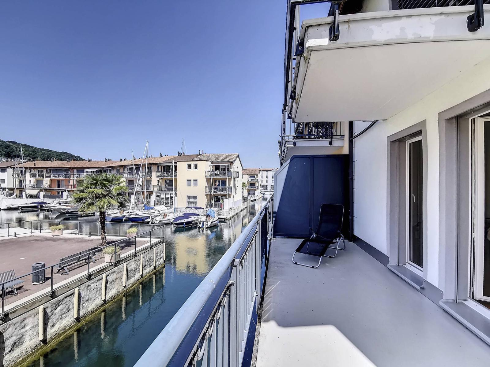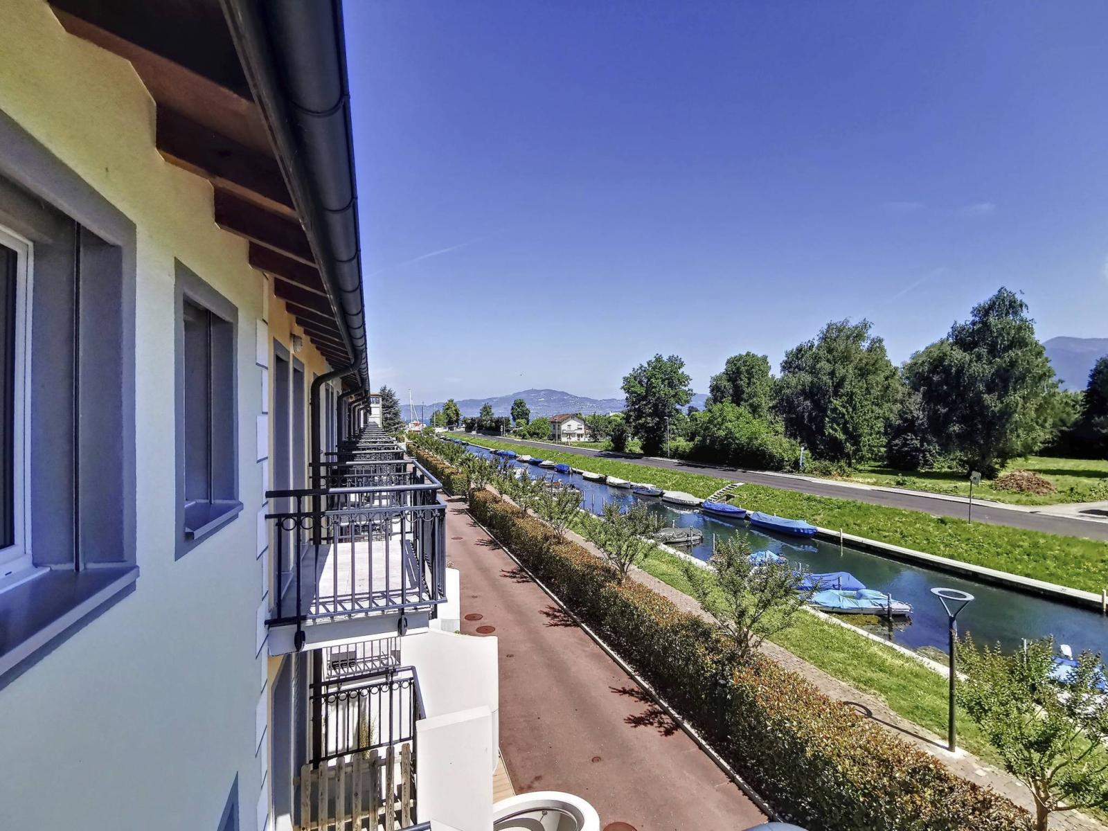 - Una camera da letto con soppalco e balcone con vista sul bacino di ormeggio;- Un bagno con doccia/WC + colonna lavatrice/asciugatrice;- Una camera con bagno/WC privato;- un balcone con vista sul canale e sul Lago di Ginevra.