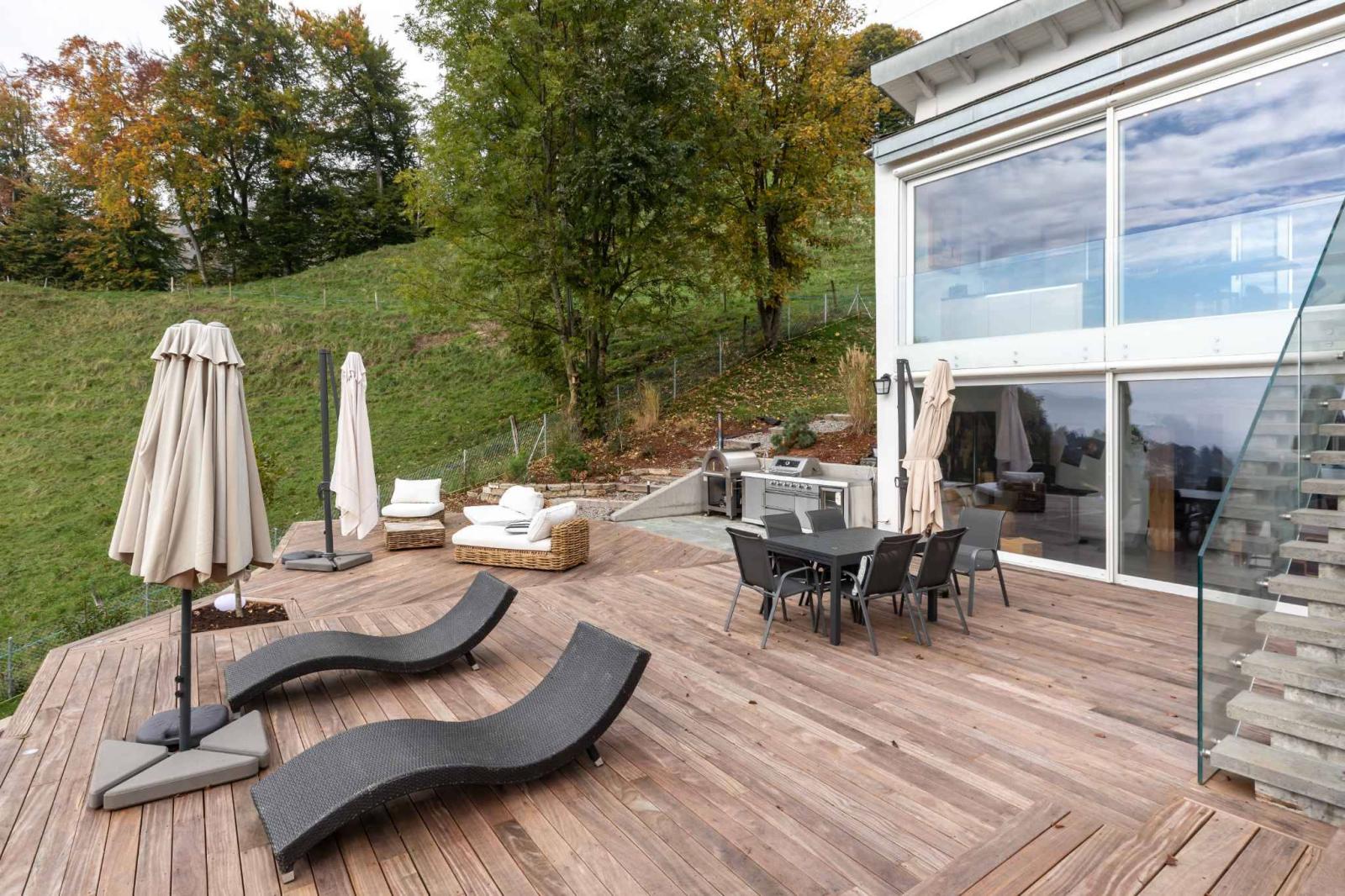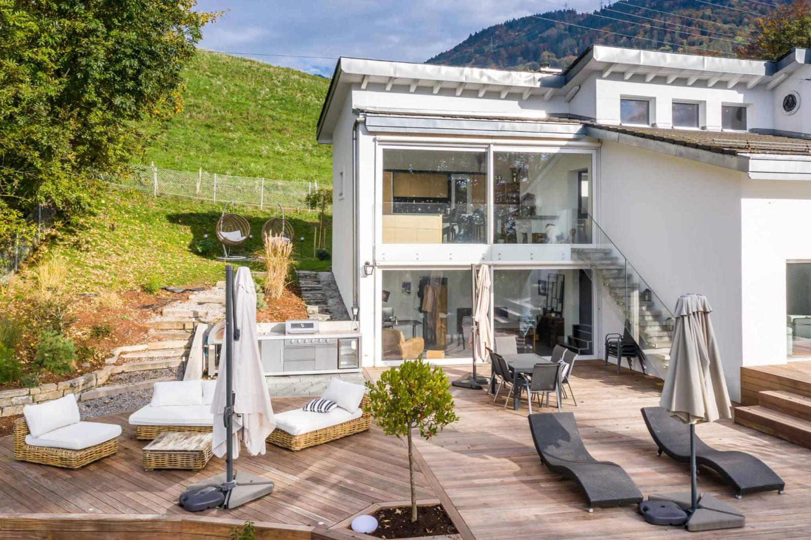 - Un'ampia terrazza arredata, completa di zona lounge, cucina esterna e vasca idromassaggio.
