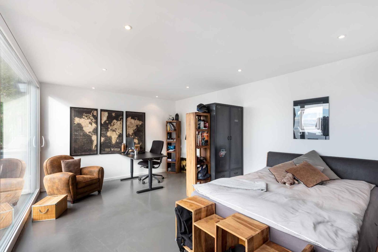 - Una master suite composta come segue: uno spogliatoio, un bagno con doccia/WC, nonché una seconda zona spogliatoio con accesso alla terrazza sul tetto.
