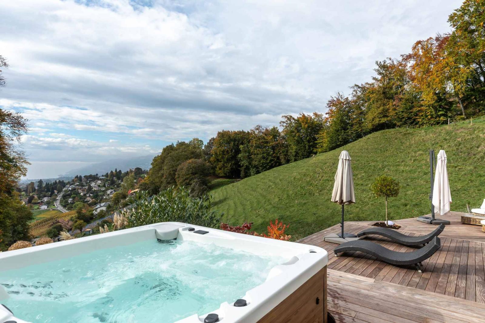 L'esterno, splendidamente paesaggistico nel 2024, offre diverse aree relax con vasca idromassaggio, ideali per momenti di relax, così come per pasti con la famiglia o gli amici.