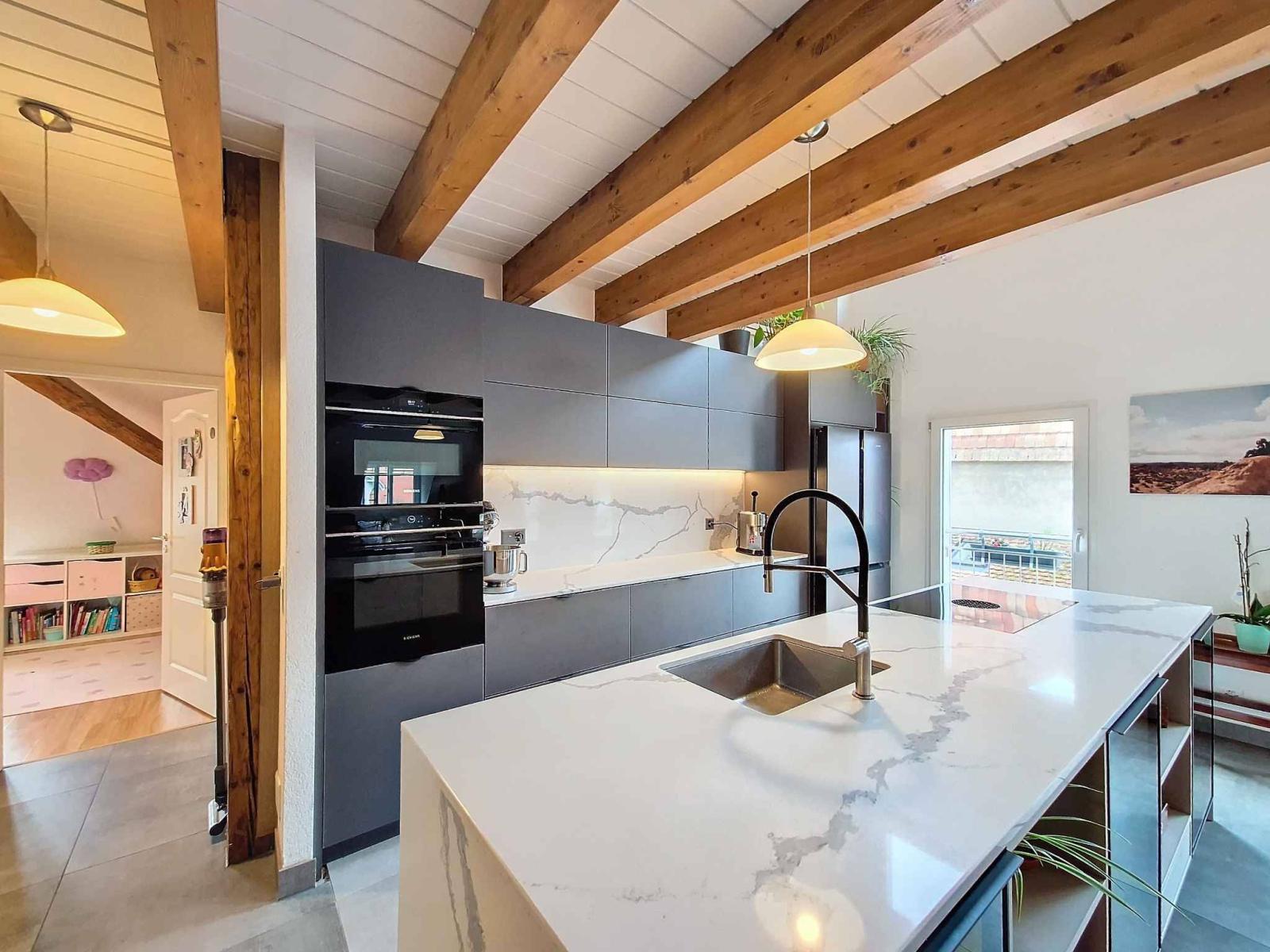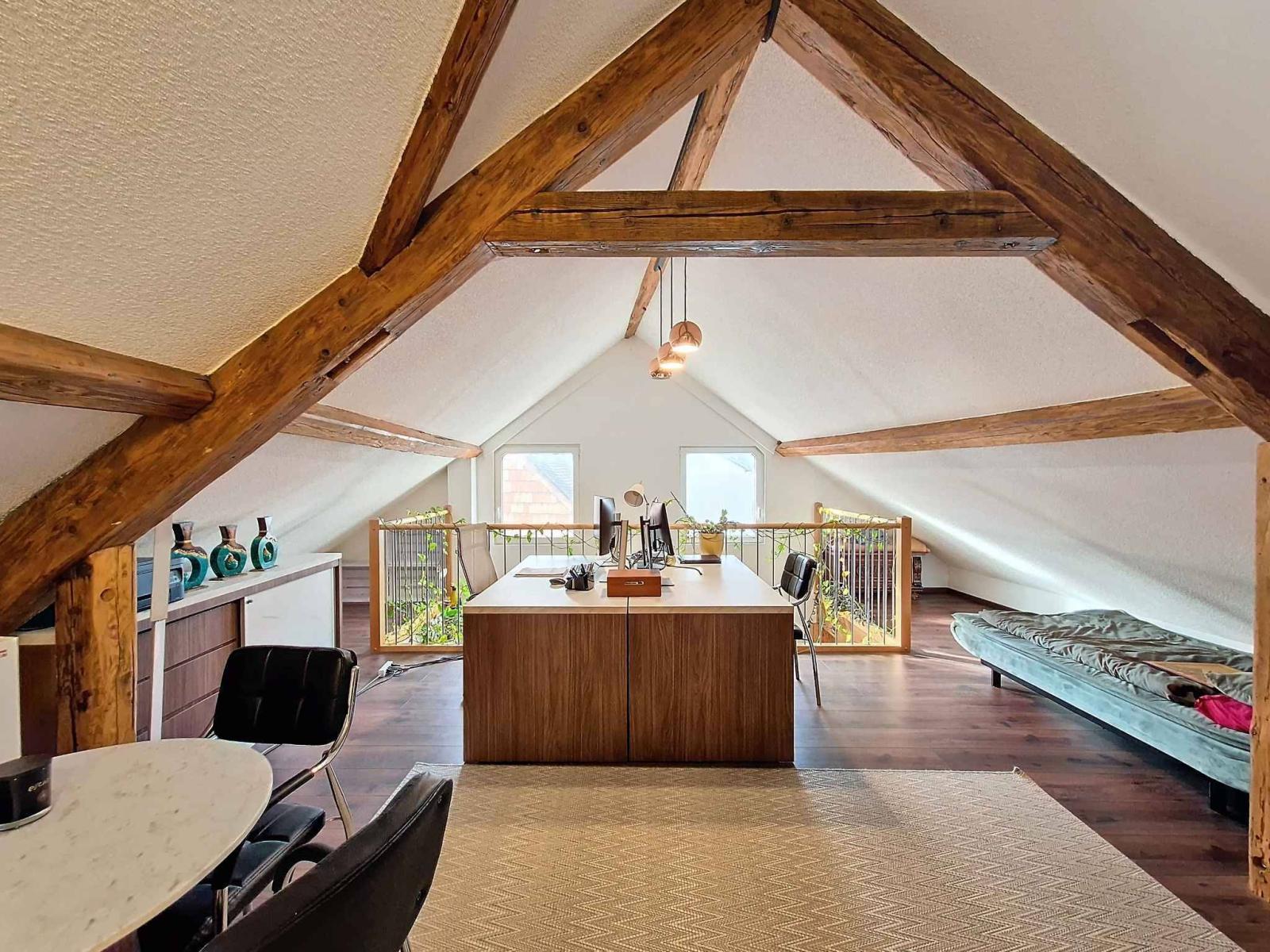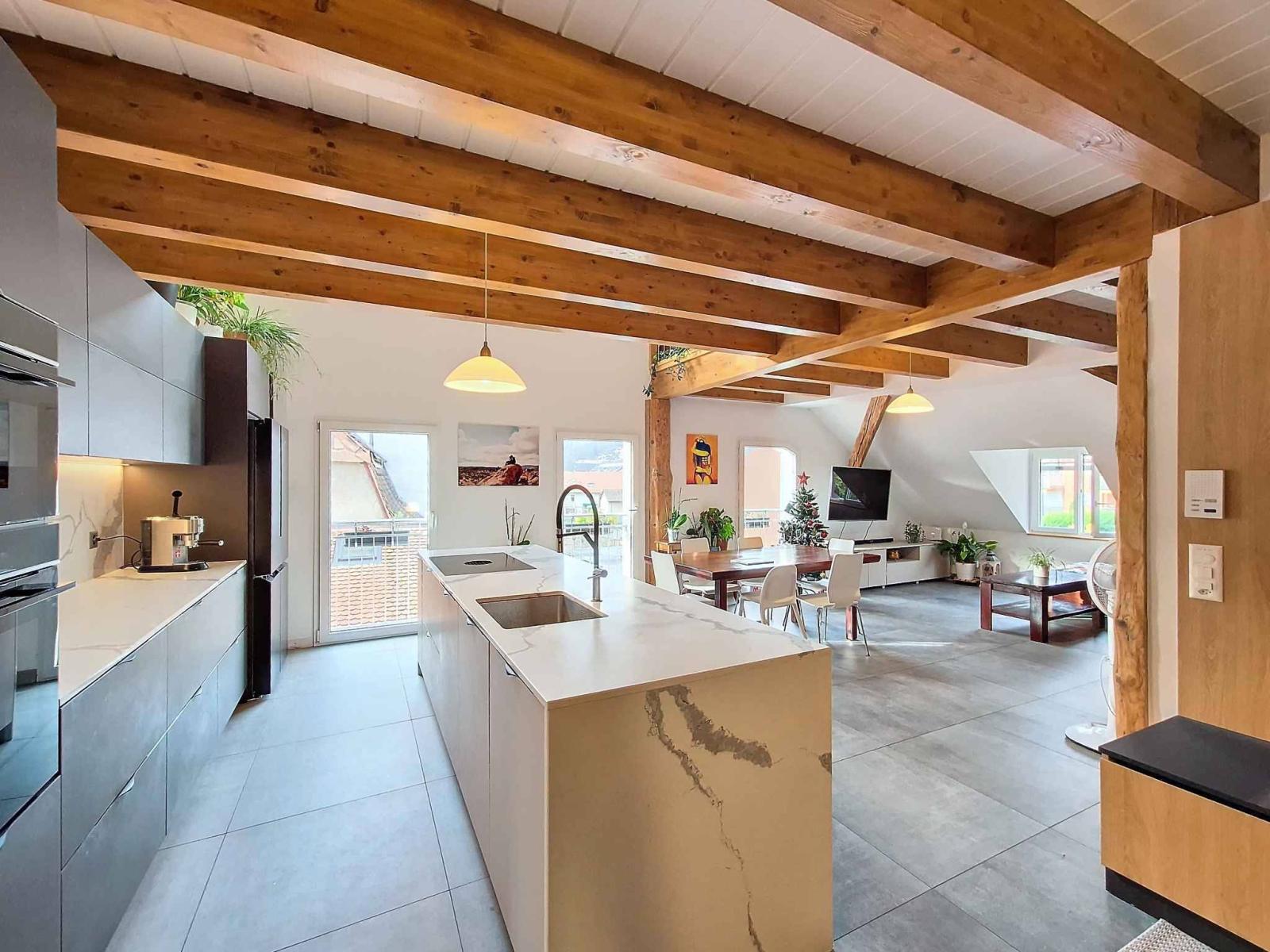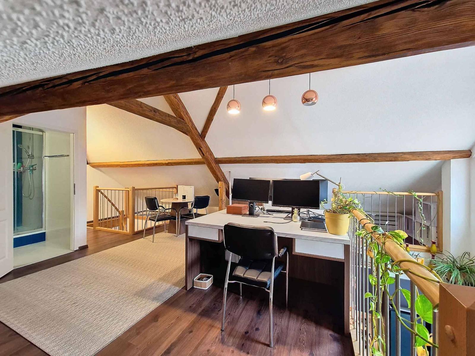 Al piano superiore, il soppalco aggiunge una dimensione in più a questo appartamento. Questo spazio versatile può essere organizzato secondo i tuoi desideri: ufficio, master suite o area relax, le possibilità sono molteplici.