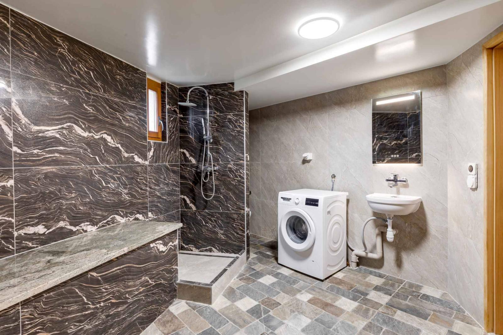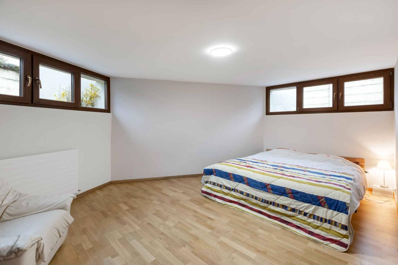 Il seminterrato offre altre due camere da letto con luce naturale, una delle quali molto grande che può essere utilizzata come sala giochi/palestra con luce naturale, un bagno e una sauna. Una lavanderia, una cantina, il locale tecnico e la filtrazione della piscina completano l'insieme.