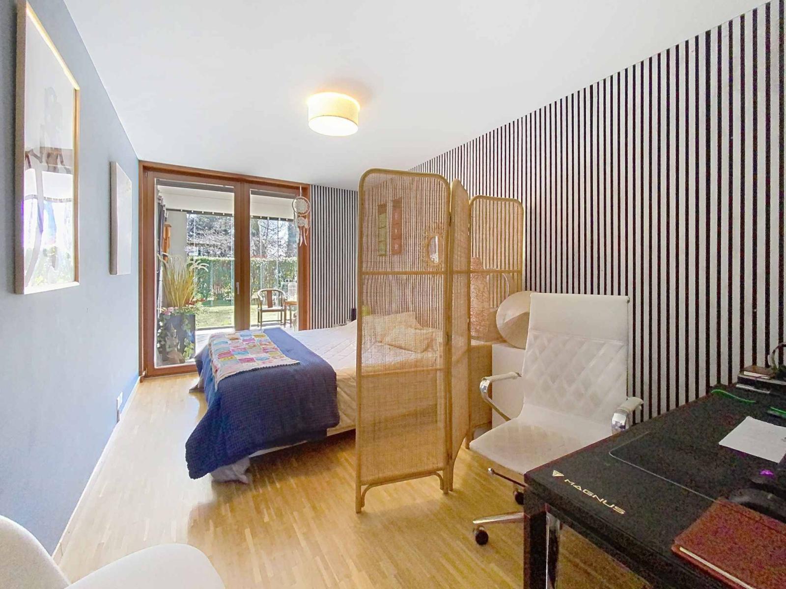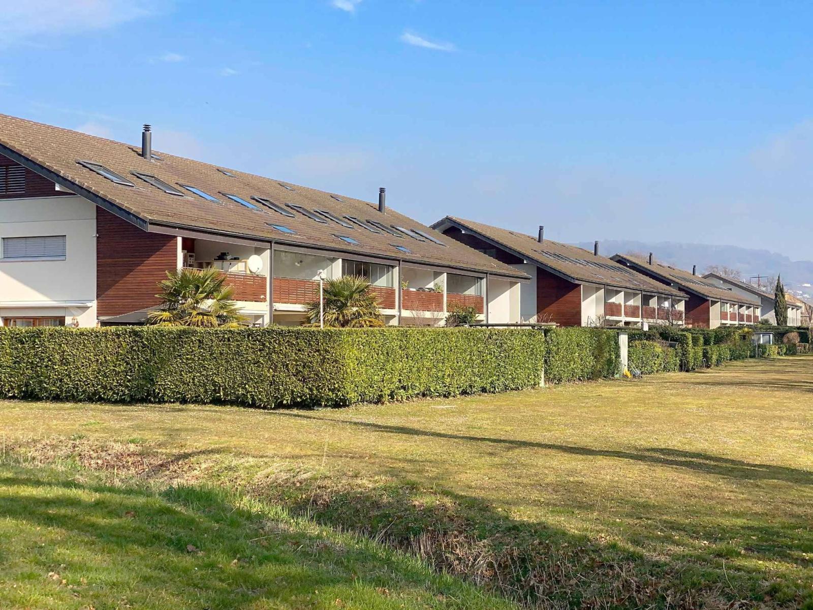 La loggia è coperta e permette di pranzare all'aperto, il giardino di 170 m² offre una bellissima vista libera sulle Alpi e senza ostacoli e un'esposizione a sud-ovest.