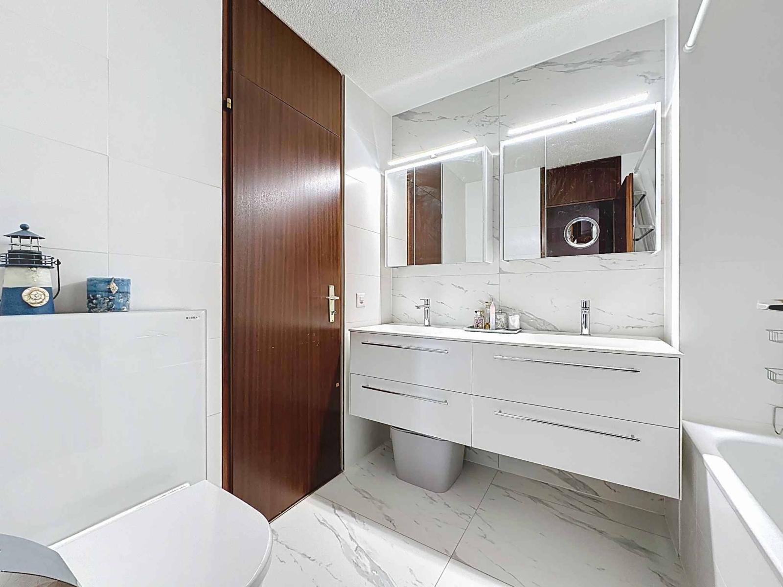 Situato al 1° piano di un piccolo PPE di 16 lotti distribuiti su due ingressi di edifici, questo appartamento caratteristico di 147 m² ponderati (superficie abitabile di 132 m2) è stato ristrutturato nel 2020 con materiali di qualità.