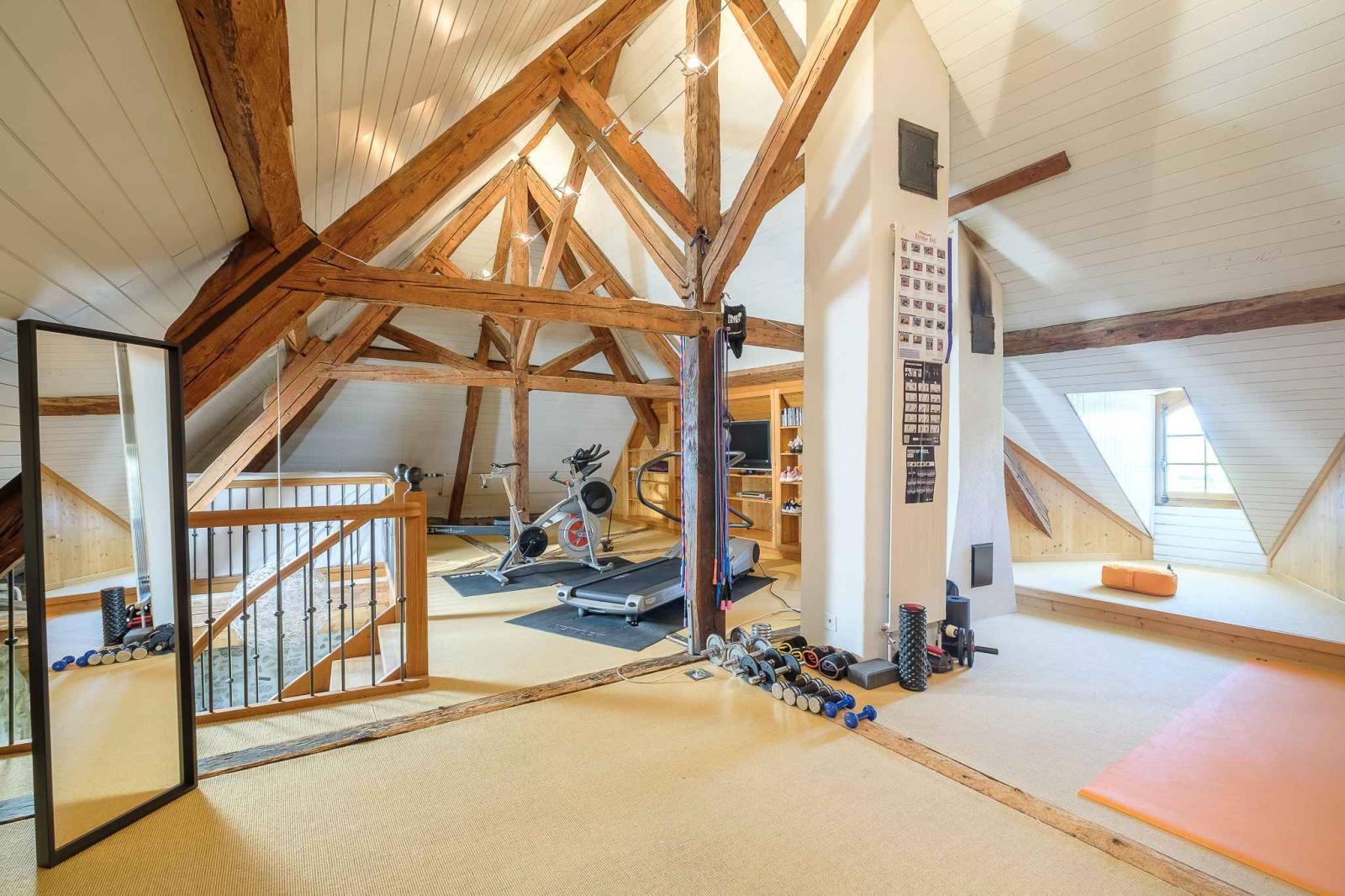 Il secondo livello, con travi a vista e soffitti alti, offre un ampio spazio attualmente adibito a palestra, con soppalco e ampi spazi di stoccaggio. Sono disponibili anche altre due camere da letto.