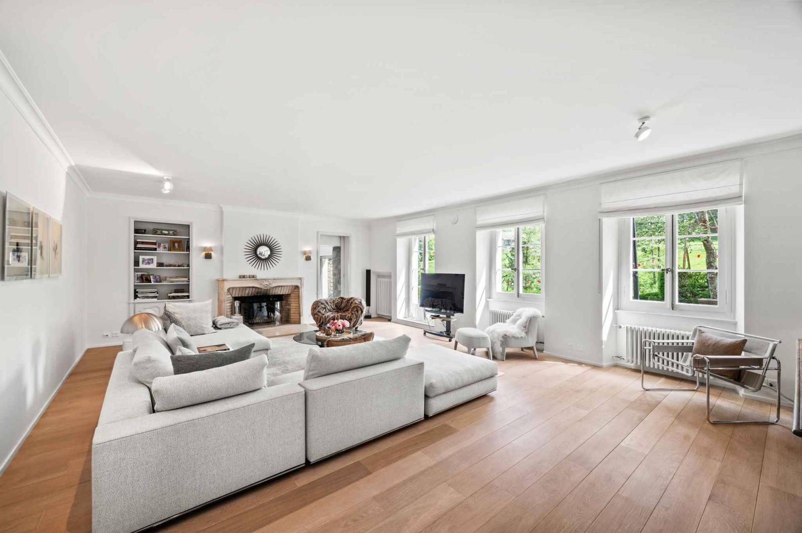 Fin dall'ingresso, il tono è dato da volumi generosi, materiali nobili, luce naturale onnipresente e finiture di pregio. L'ampio ingresso con guardaroba si apre su splendide aree di ricevimento, tra cui due accoglienti salotti con camini d'epoca, una conviviale sala da pranzo e una cucina elegantemente disposta attorno a un'isola, prolungata da una terrazza esposta a sud e da una soleggiata piscina. Altre tre terrazze, idealmente orientate a sud-ovest, sud-est e est, offrono ognuna un'atmosfera diversa, permettendo di godere del sole durante tutto il giorno e di ammirare le mutevoli prospettive della natura circostante.