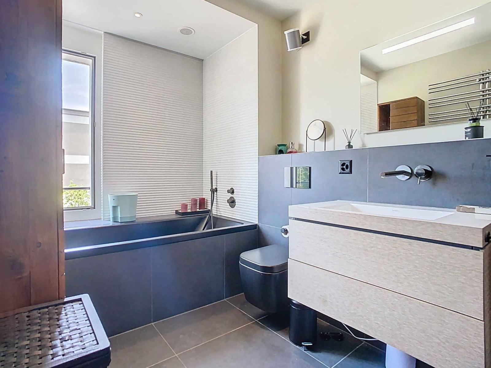 Completamente riprogettata e ampliata nel 2018, la proprietà coniuga elegantemente il comfort contemporaneo con una forte sensibilità ambientale. Energia geotermica, pannelli solari (termici e fotovoltaici), soffitto raffrescato, ventilazione centralizzata e ascensore integrato dimostrano un chiaro impegno per l'efficienza energetica e il benessere quotidiano.