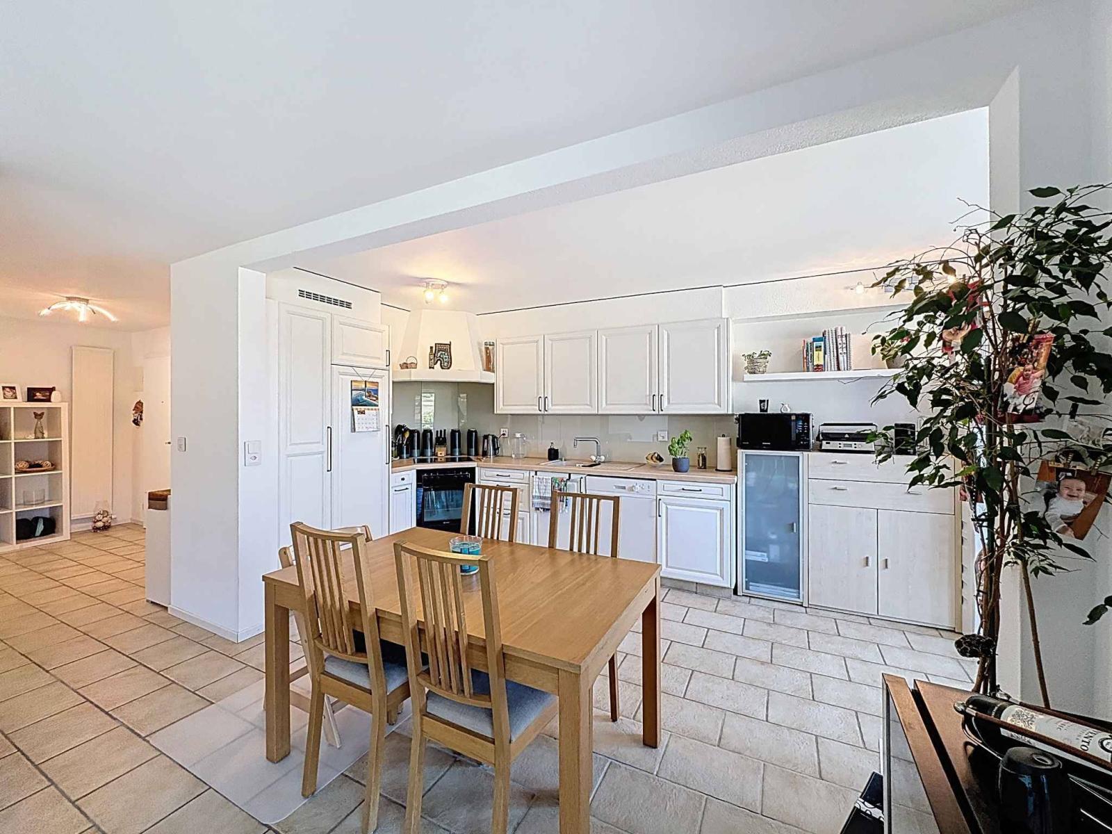 La disposizione degli interni è stata attentamente progettata per soddisfare le esigenze di una famiglia o di una coppia in cerca di spazio e praticità. Troverete tre spaziose camere da letto, un bagno separato e un moderno bagno dotato di un secondo WC. La cucina a vista, perfettamente integrata nel luminoso soggiorno, invita alla convivialità ed è corredata da un'ampia zona pranzo. Il soggiorno, caldo e accogliente, è impreziosito da un camino che conferisce un fascino innegabile alle vostre serate invernali. Ampie vetrate a bovindo estendono il soggiorno su un piacevole balcone, ideale per godersi le belle giornate in completa tranquillità.