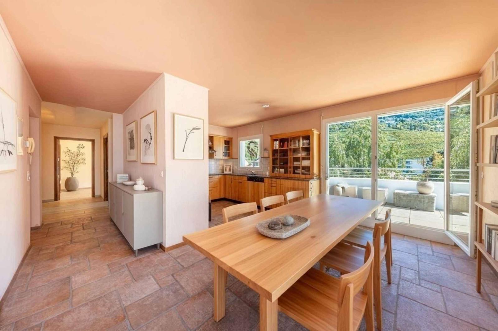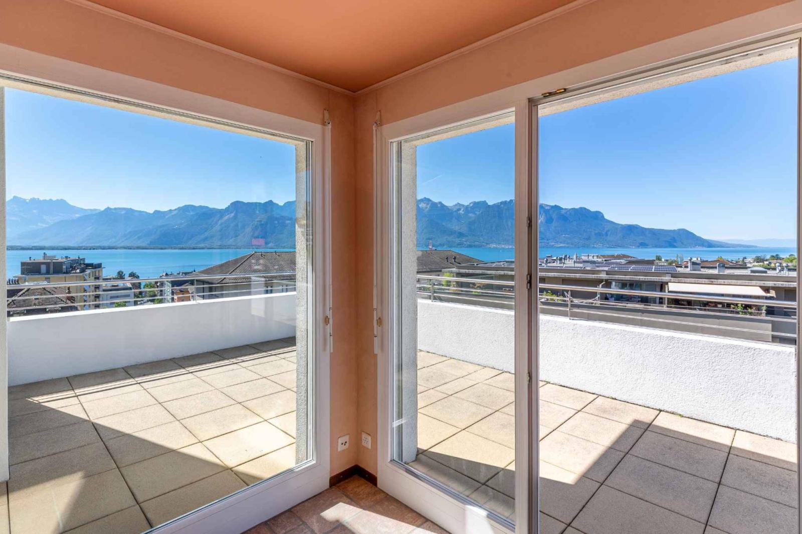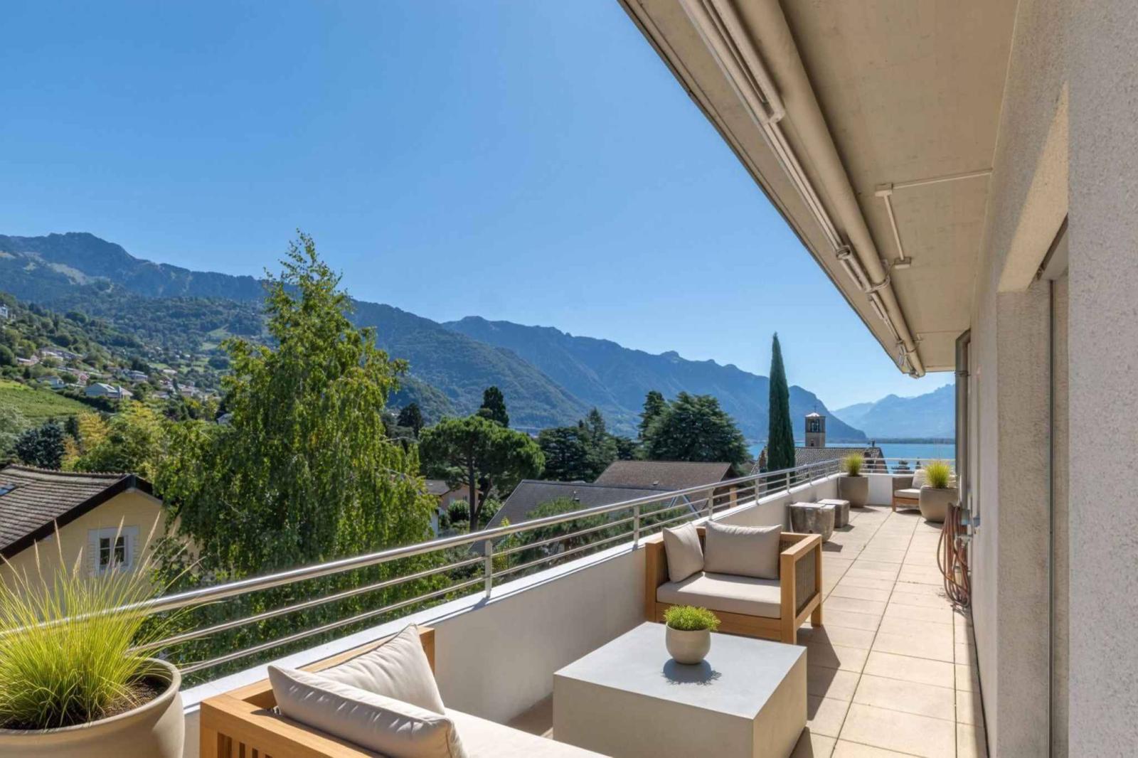 L'appartamento dispone di una straordinaria terrazza a 360 gradi di quasi 130 m², che offre una vista panoramica mozzafiato sul Lago di Ginevra, sui vigneti circostanti e sulle Alpi.