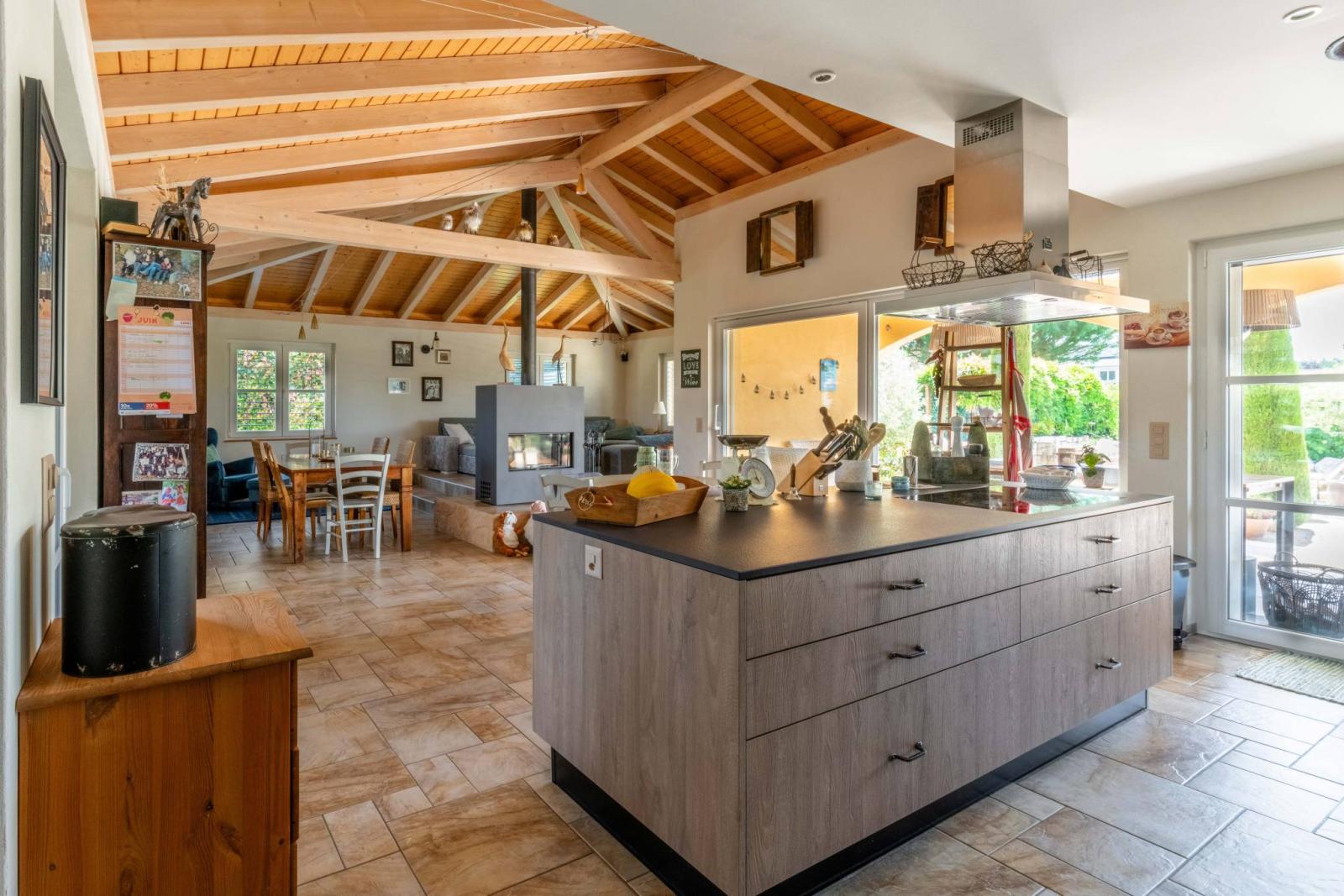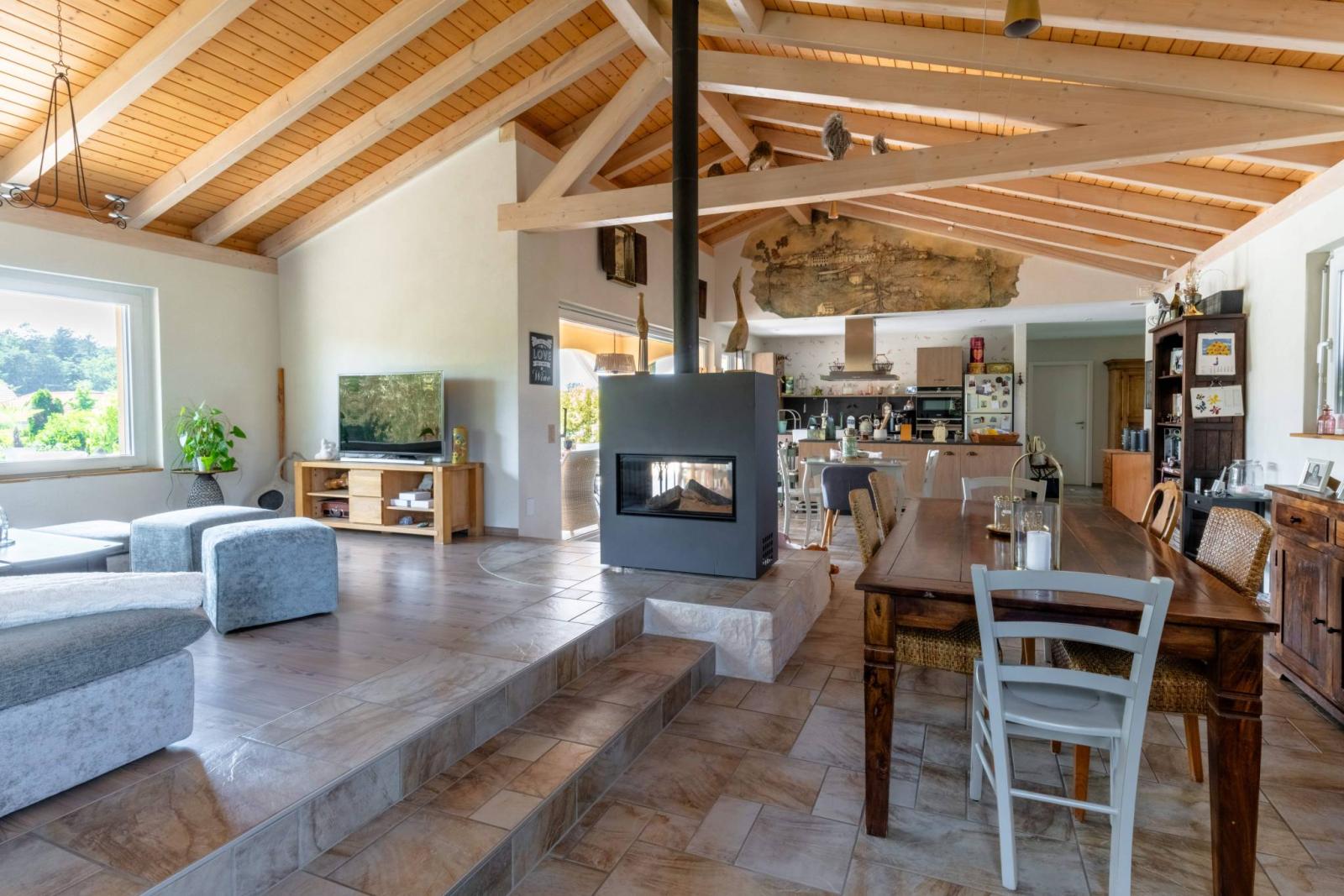 - Salle à manger avec cheminée centrale et accès terrasse