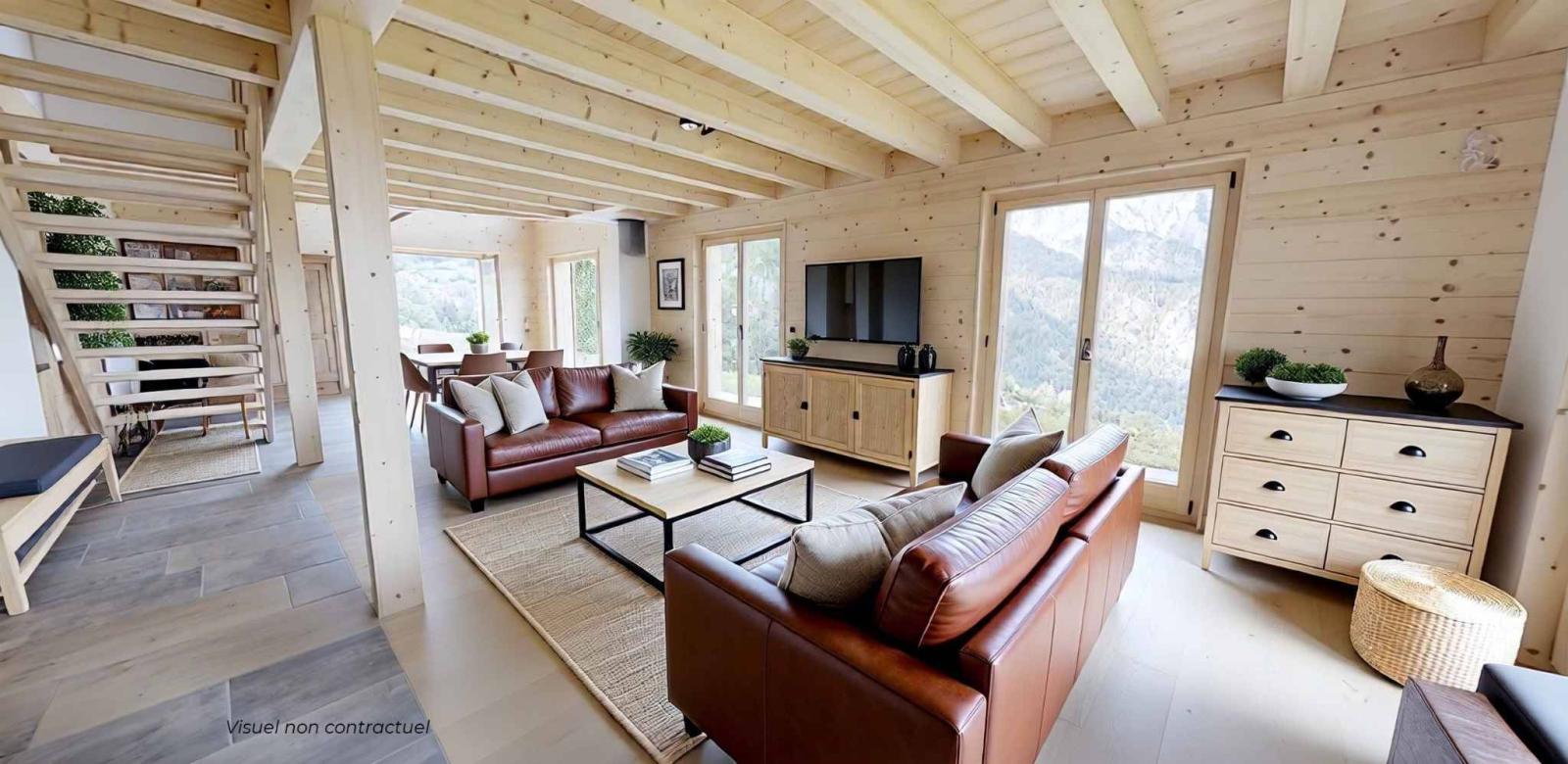 Lo chalet comprende un soggiorno/cucina con soppalco di circa 35 m² (fino a 50 m² opzionali), tre camere da letto, un soppalco di ~14 m², un ufficio sottotetto di ~10 m², nonché un locale tecnico/cantina nel seminterrato con accesso diretto dai parcheggi coperti.