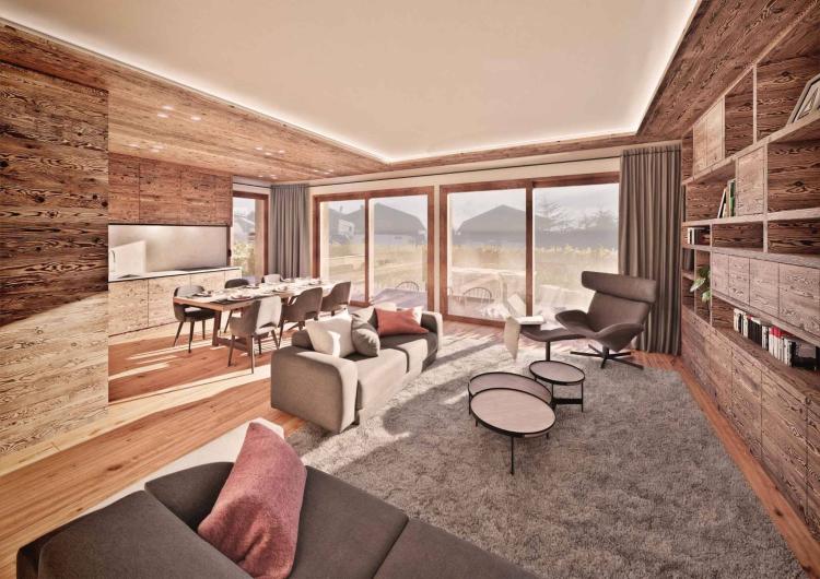 Progettato attorno a uno spazio abitativo accogliente e perfettamente orientato, l'interno si apre su una terrazza privata, ideale per godersi la vista alpina e le stagioni miti. La disposizione del soggiorno, della sala da pranzo e della cucina a pianta aperta crea un'atmosfera accogliente e invita alla convivialità.