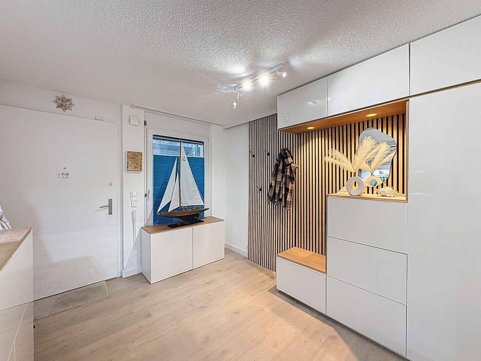L'elegante cucina a vista si integra perfettamente in questo accogliente spazio abitativo e beneficia di un'area ripostiglio adiacente, che offre una soluzione di stoccaggio discreta ma pratica. Una camera da letto versatile, che può essere aperta sul soggiorno o arredata in modo indipendente a seconda delle esigenze, e un bagno con doccia completano armoniosamente questo piano.