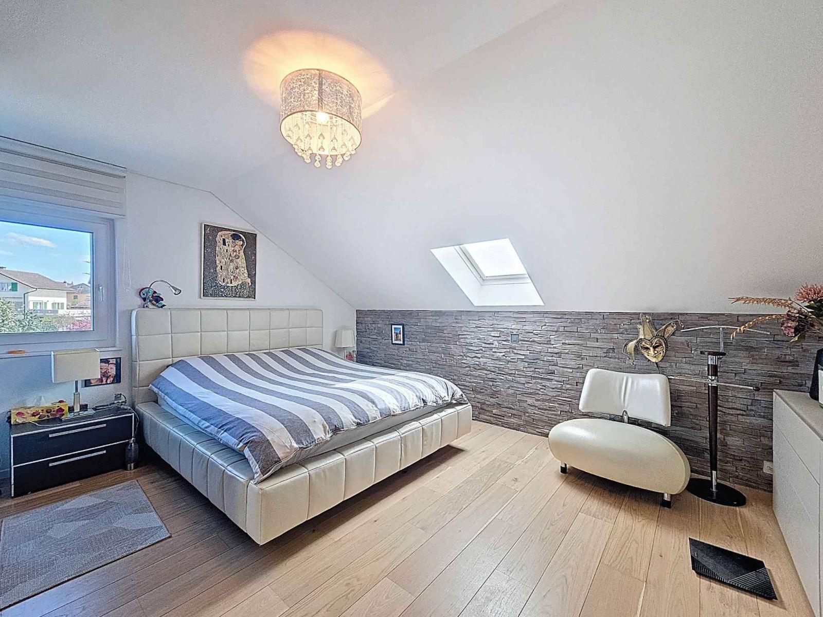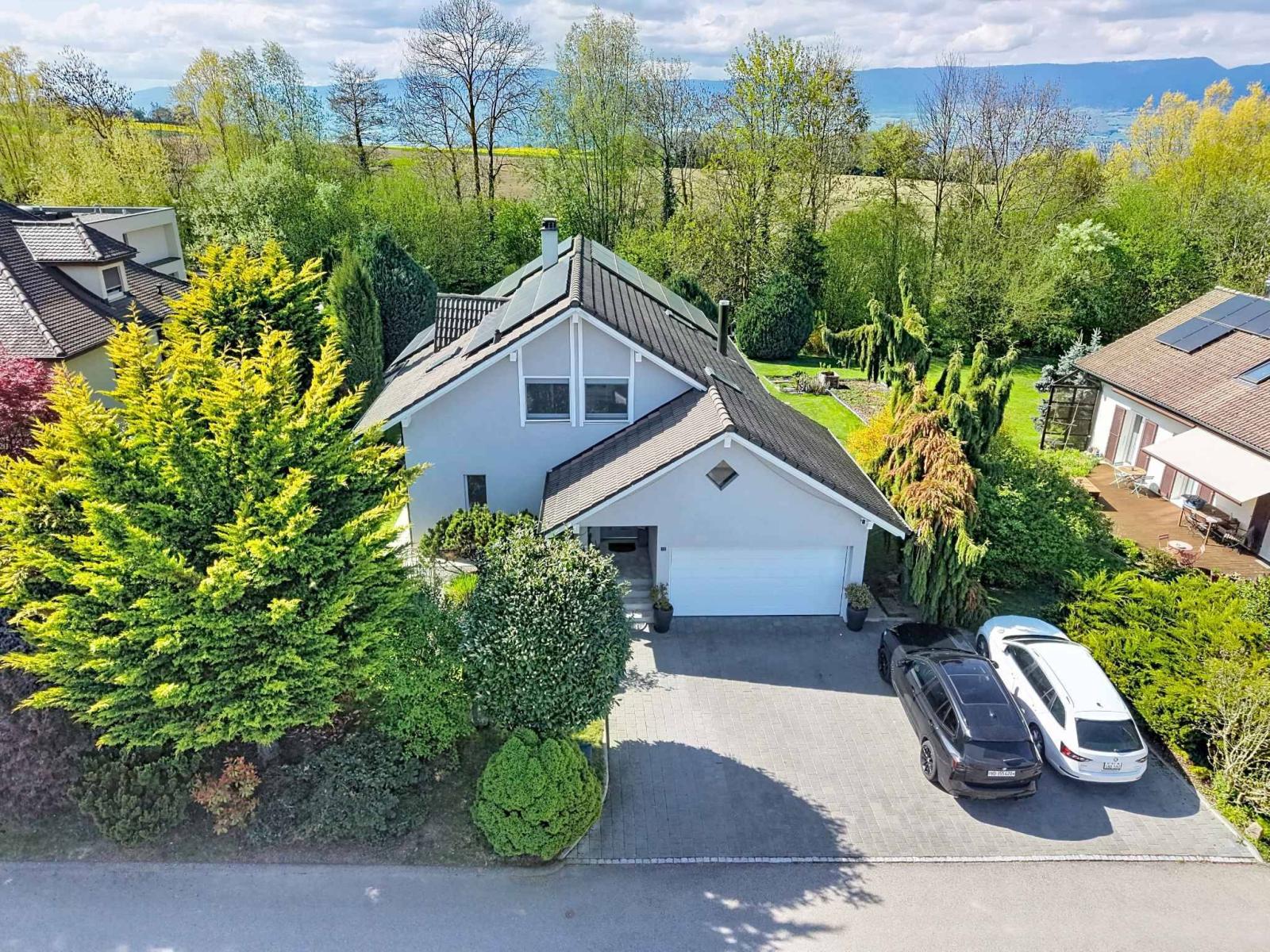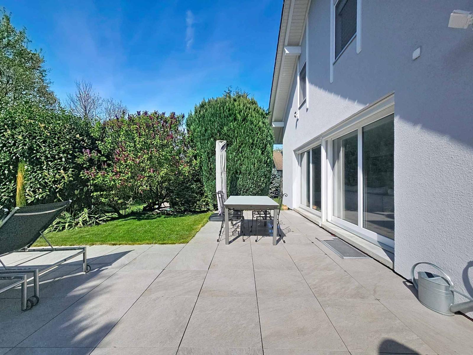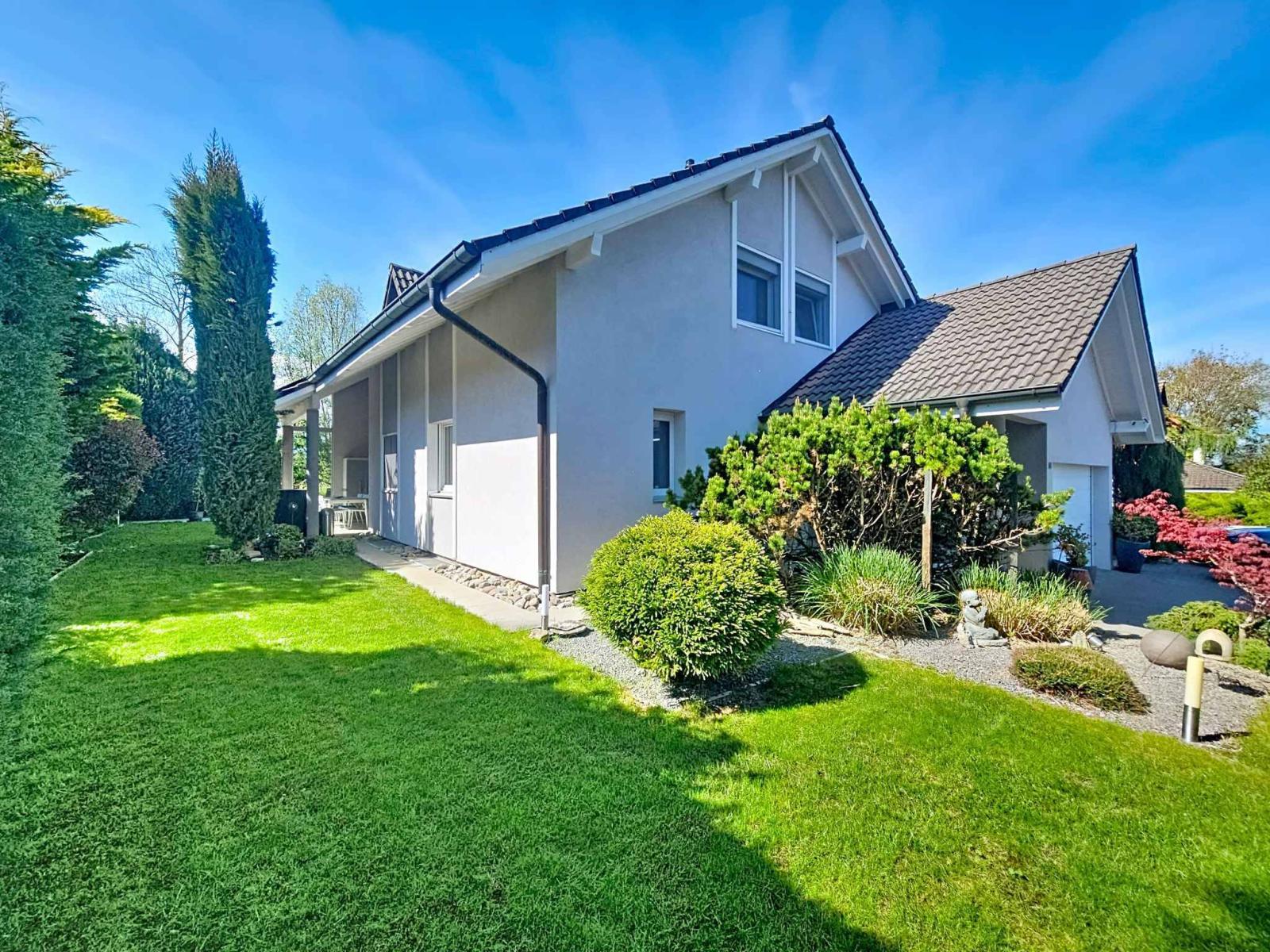Magnifica villa indipendente di 5,5 locali, costruita nel 1989 e meticolosamente ristrutturata nel 2007 e nuovamente nel 2022, situata in una tranquilla e ambita zona residenziale. Con circa 156 m² di superficie abitabile (240 m² di superficie totale) e un volume di 1.183 m³, questa proprietà colpisce per i materiali di alta qualità e lo stile contemporaneo. La casa si sviluppa su due livelli con un seminterrato completamente rifinito che comprende una sala cinema, una palestra, una cantina, oltre a locali di servizio e ripostigli.