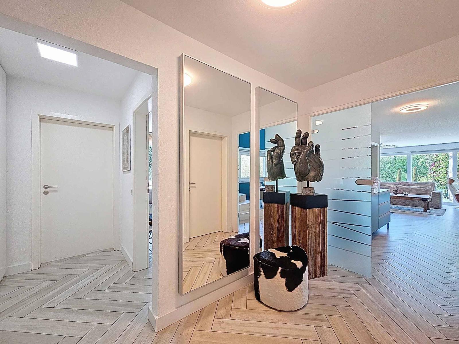 La proprietà comprende anche un ampio garage con porta elettrica e quattro posti auto esterni. Esiste inoltre un ulteriore potenziale di ampliamento, che offre interessanti possibilità.