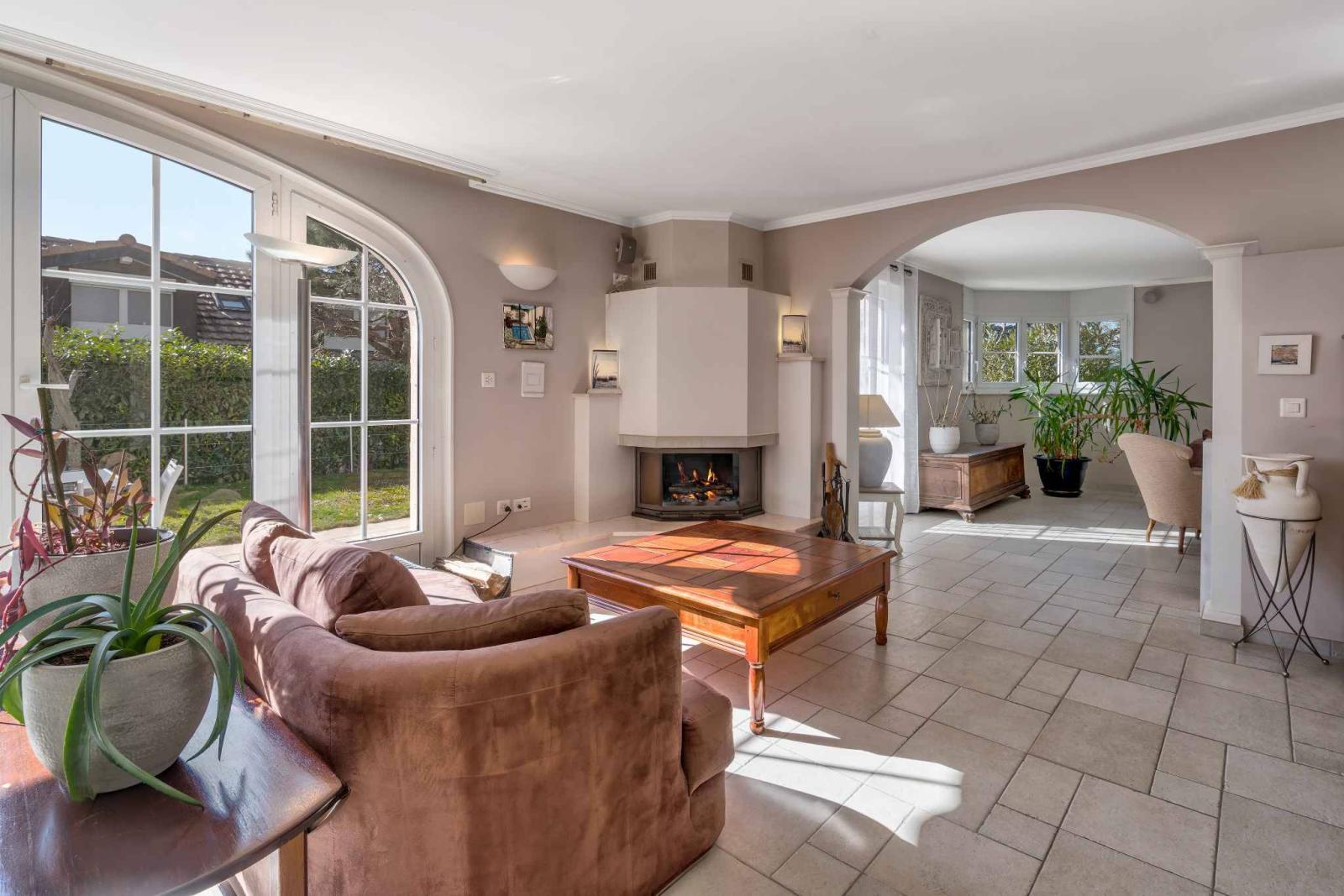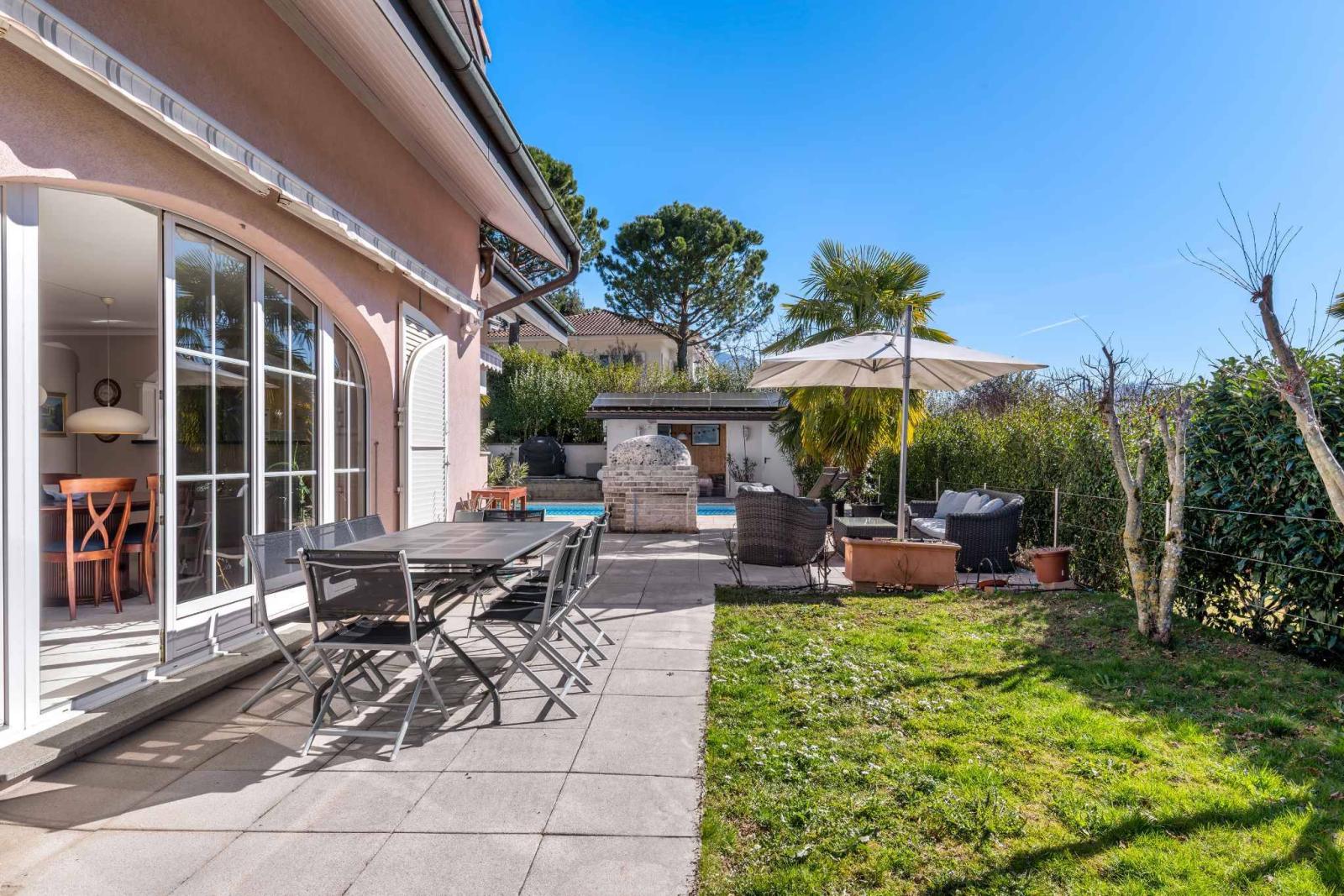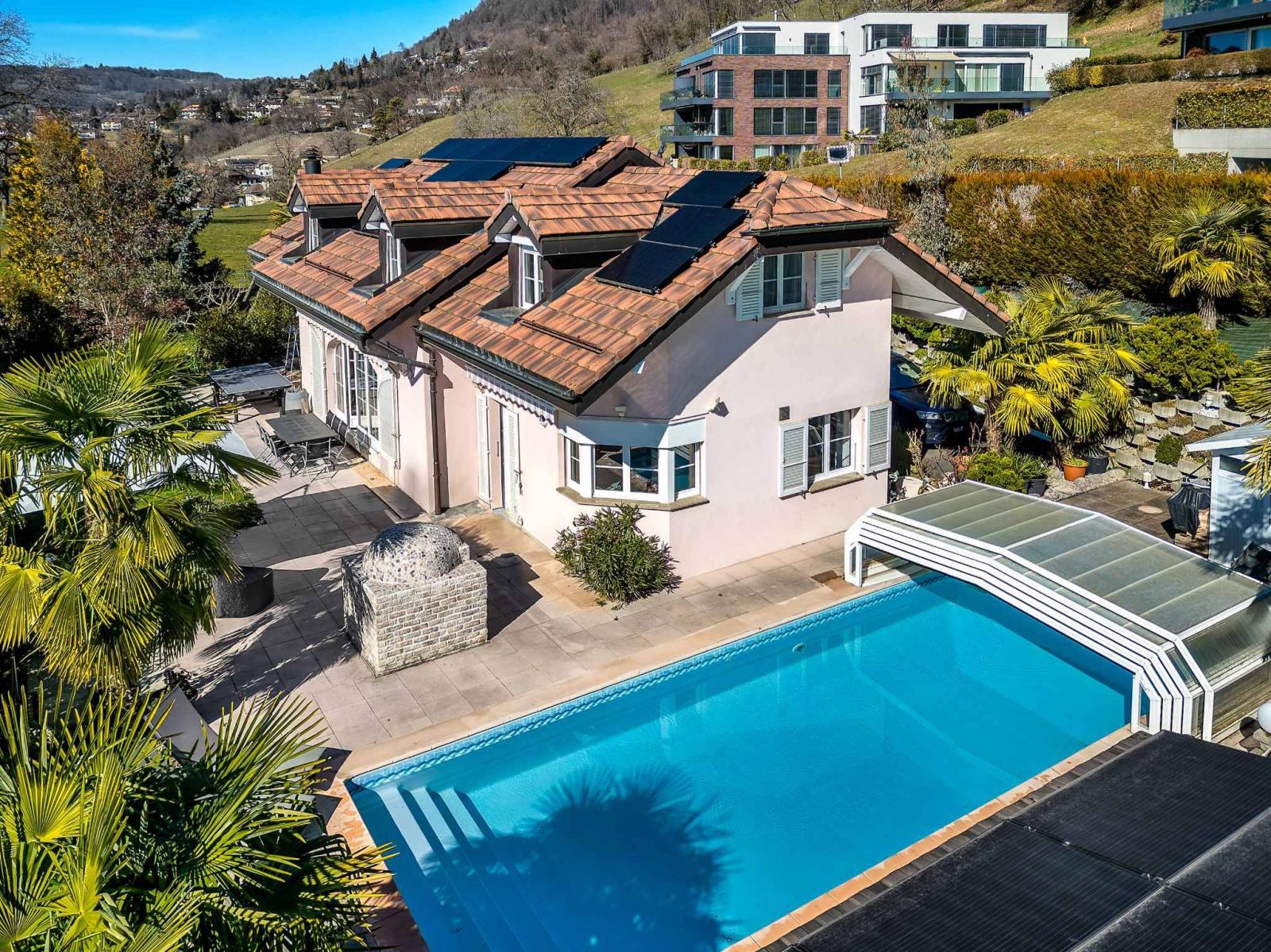 Con circa 230 m² di superficie abitabile e circa 300 m² di superficie totale, questa residenza si distingue per le sue generose proporzioni e l'eccezionale luminosità naturale. Il piano terra presenta un ampio soggiorno con colonnati e camino, che si apre su una grande terrazza esposta a sud, offrendo splendide viste sulle montagne e scorci sul lago.
