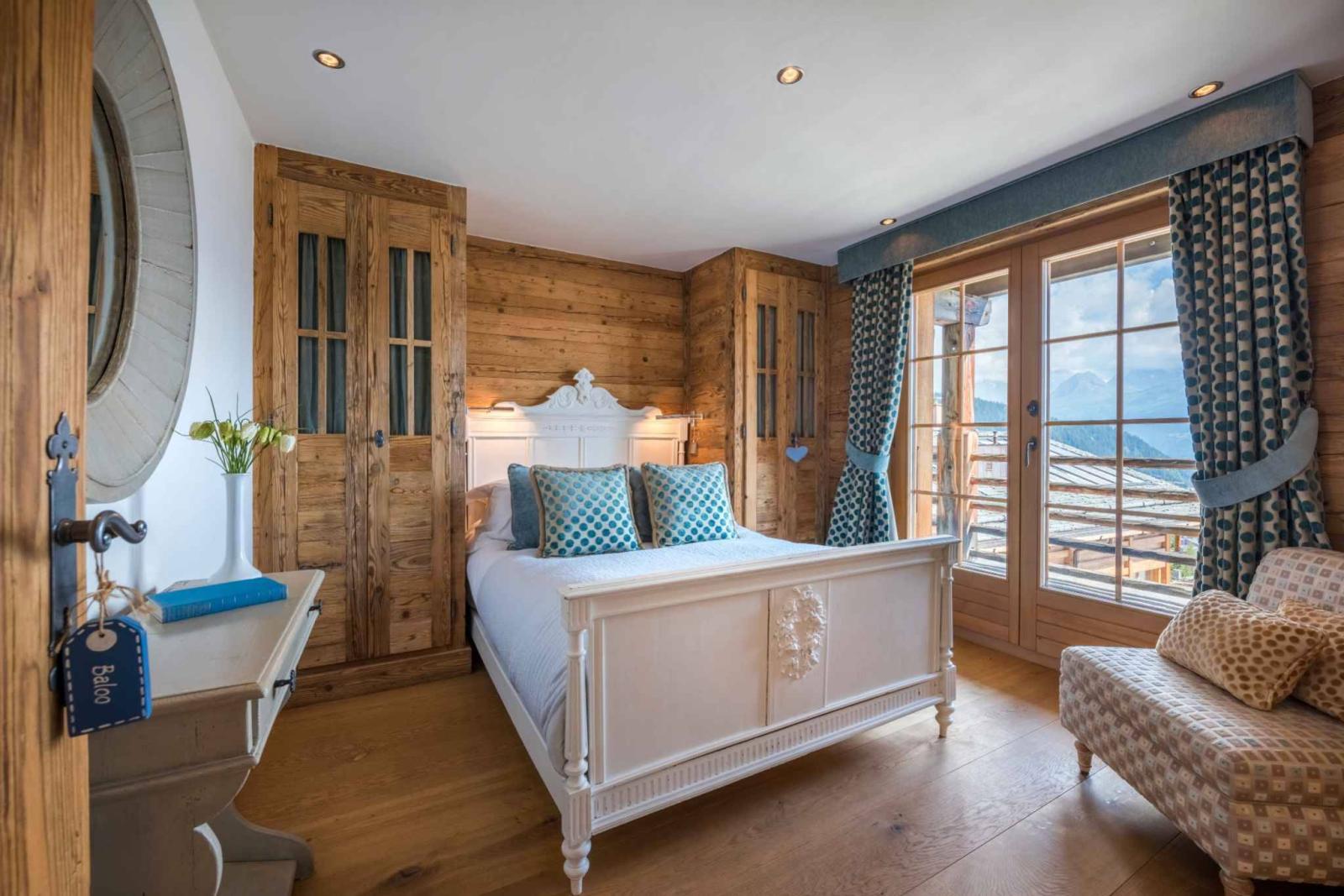 Infine, l'ultimo piano ospita la suite padronale, incastonata sotto la grondaia. Dispone di un balcone privato, di una cabina armadio passante e di un bagno con doccia separata, ed è arredata con gusto. Altre due camere da letto si trovano a questo livello: una matrimoniale e una con letto queen-size, ciascuna con il proprio bagno con doccia e un arredamento unico, permeato dal fascino alpino.