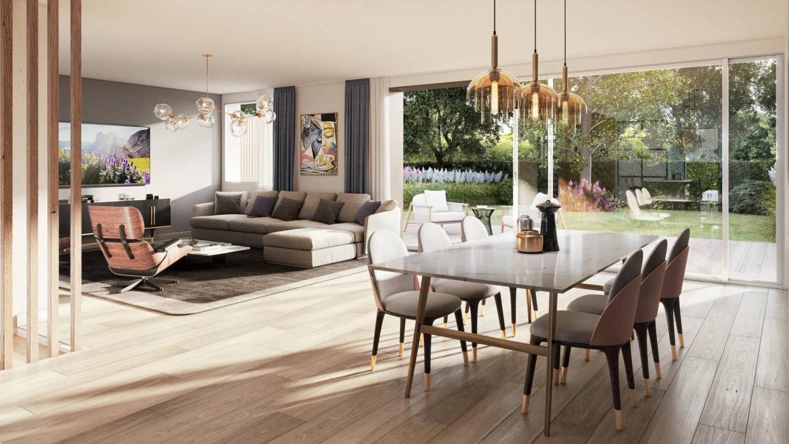 Questa magnifica villa adiacente dalle linee contemporanee offre più di 350 m² di spazio utile distribuito su 3 livelli.